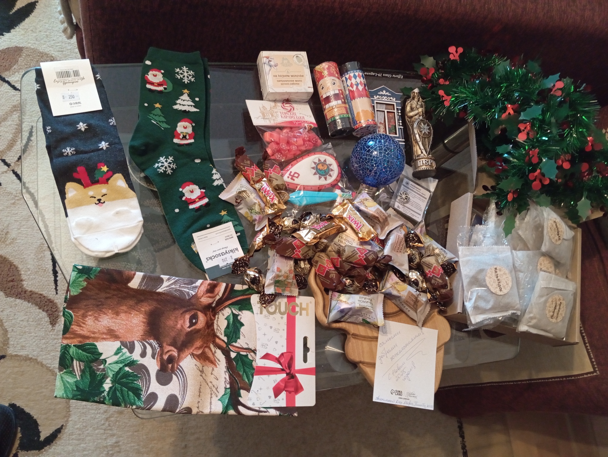 Носочки, мыло ручной работы, хлопушки, магнитик, статуэтка Перуна, оберег коловрата, пряники со славянской росписью (я писал, что увлекаюсь славянской культурой), новогодняя игрушка на ёлку, конфетки разные и местные тоже, полотенце, менажница и набор для приготовления настоек