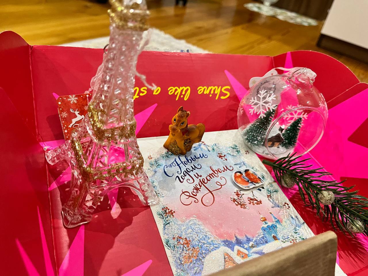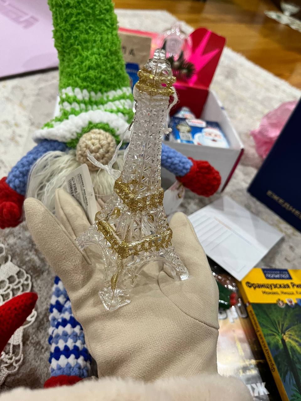 и вот новогодние игрушки!! Эйфелева башня и очень милый шар со снежным домиком и елочками. я очень рада СПАСИБО БОЛЬШОЕ!!