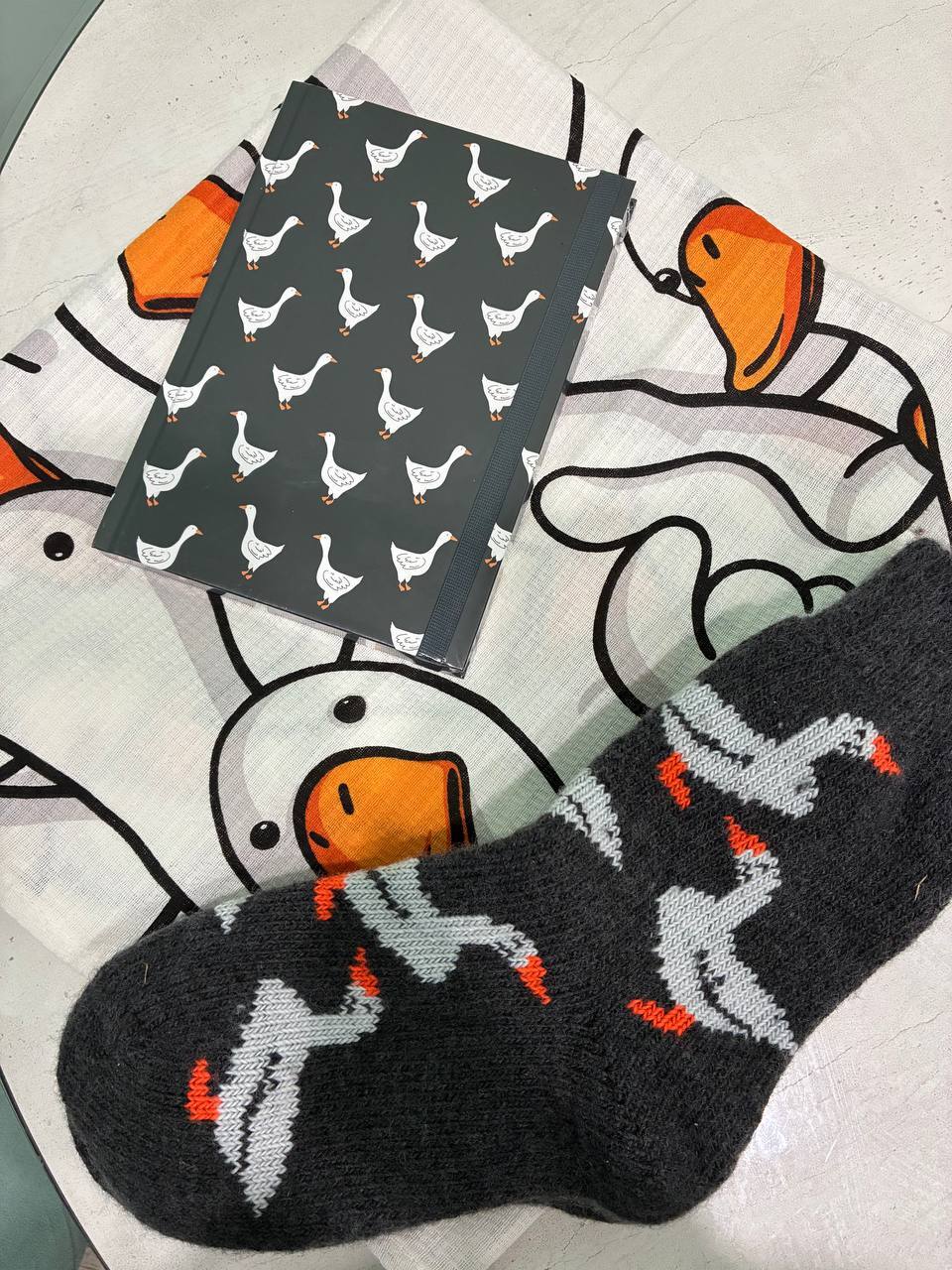Среди подарков оказались пакетики с сюрпризами, я объединила их общей темой: ГУСЬ! Это моё тотемное животное. Обожаю его и даже шуточное «гусь за жопу кусь» меня не пугает. В наборе нашлись ежедневник, полотенце и тёплые классные носки. Обязательно надену их, когда буду кататься на коньках. Просто восторг!