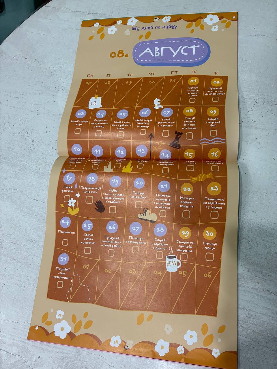 А дальше просто кайф! Наткнулась на календарь, где для каждого дня есть своё прикольное задание. Естественно, первым делом заглянула в август там же мой ДР! И тут же в голове завертелись мысли: какие цели поставить, что запланировать, как круто провести следующий год.
