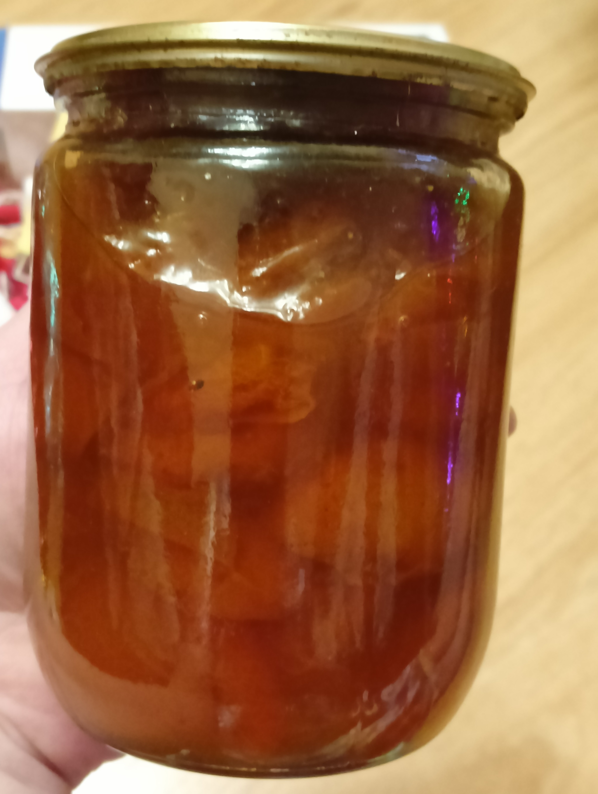 Завернутая во много слоев, и так заставившая нервничать мою дарительницу, банка была распакована. Абрикосовое варенье сварено мамой Снегурочки.