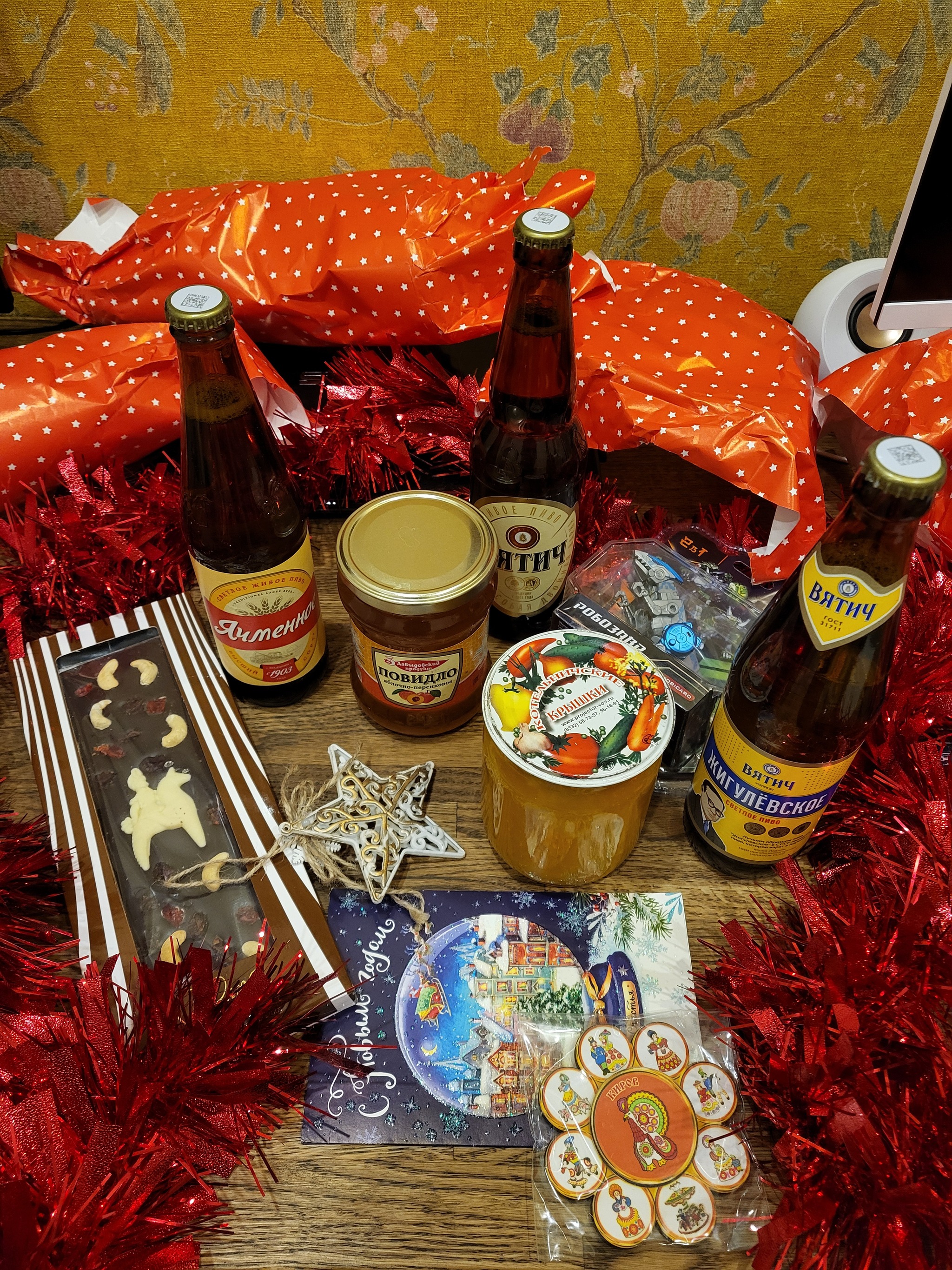Да, Дедушка Мороз (и его семья, которая оставила очень милые пожелания на открытке) явно явно хорошо подумал над моей немаленькой анкетой и решил не распылять усилия, а нанести сосредоточенный удар по её кулинарной части :) Учтена была указанная в анкете любовь к местным продуктам, всякому-разному пиву, темному шоколаду, орешкам и всяческим вареньям-соленьям. Одна баночка даже не просто "местная", а явно взята из семейных запасов! Ням!