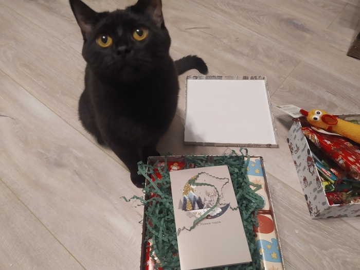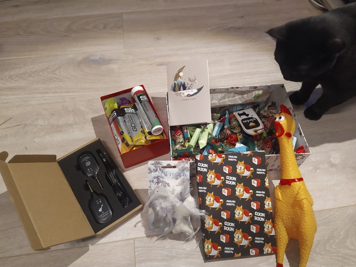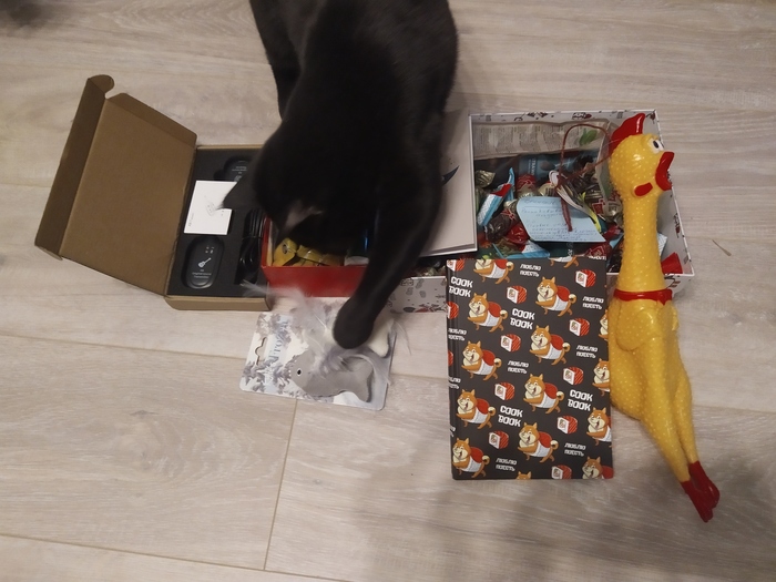 Внутри много прикольных штук. Все доехало в целости и сохранности. Ты учла все наши пожелания. Особенно понравилась блютуз штука для беспроводной игры на гитаре. Я её уже опробовал, очень круто. Кот с собачкой все посмотрели, все понюхали, погрызли, тоже рады такому подарку. Вот несколько фото: