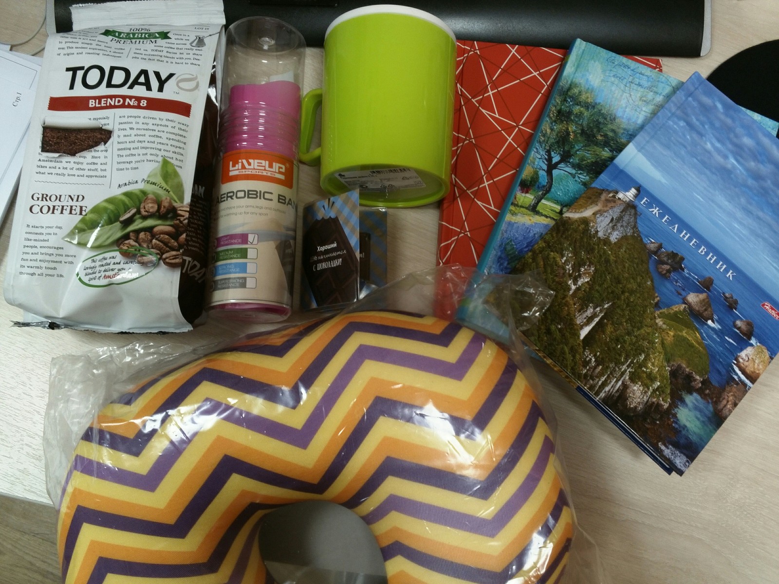 Теперь у меня есть запас чая и кофе на пару зим вперед (я в предвкушении, потому что ни одного из них не пробовала) , шоколад на случай тяги к сладкому, и даже термокружка, чтобы всё оставалось горячим. Учли мои интересы в плане фитнеса, канцелярии и путешествий - лента для упражнений, ежедневники для глобальных и не очень планов, подушка для шеи теперь в моем арсенале)). Спасибо еще раз. С новым годом! Всем тепла!