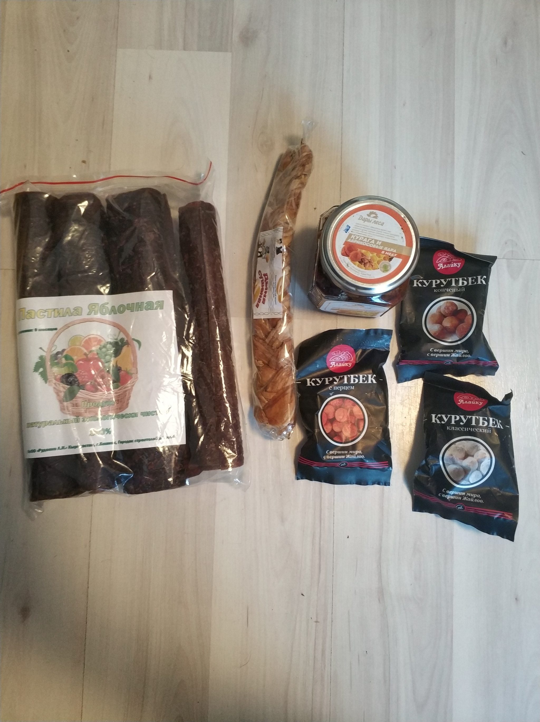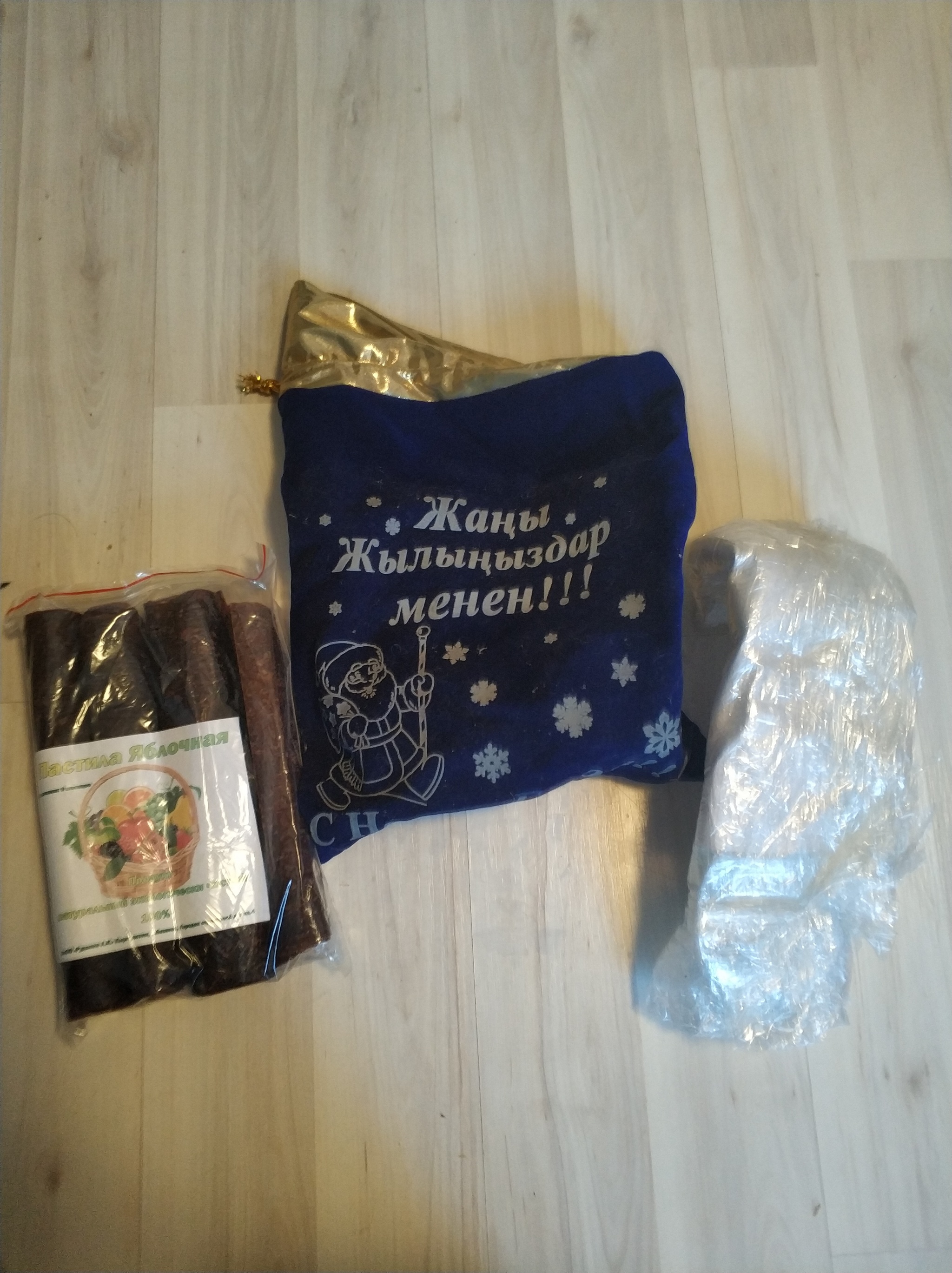 Внутри нарядный пакет с надписью и пастила из сушеных яблок. Интересно)