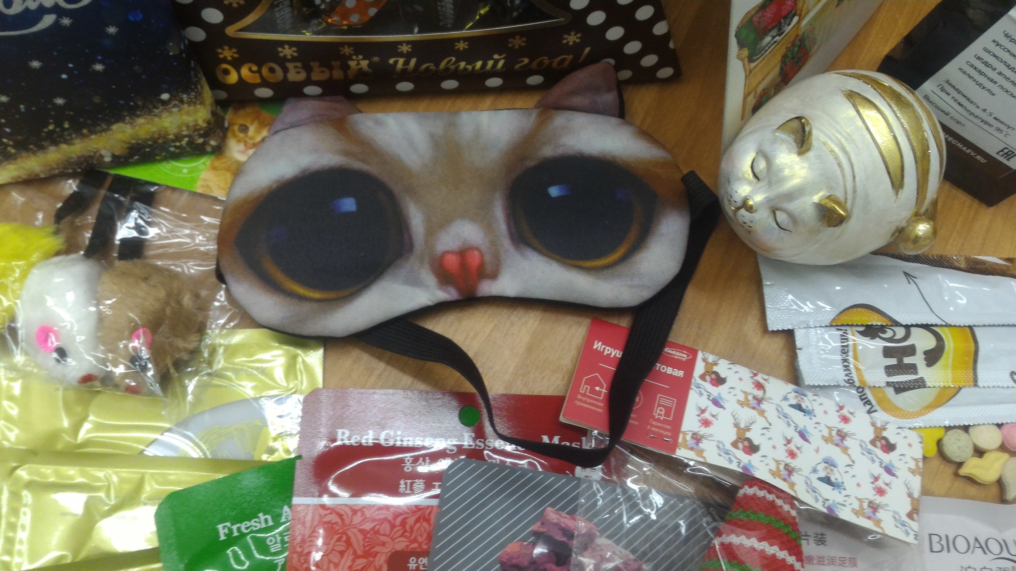 А также вкусняхи в виде витаминов и лакомых палочек для шерстяных Господ и сладости(У меня теперь есть марципановая ёлка!!! Но это ненадолго) для их верной рабы. Масочки для меня же с носочками. Праздничное настроение получено.