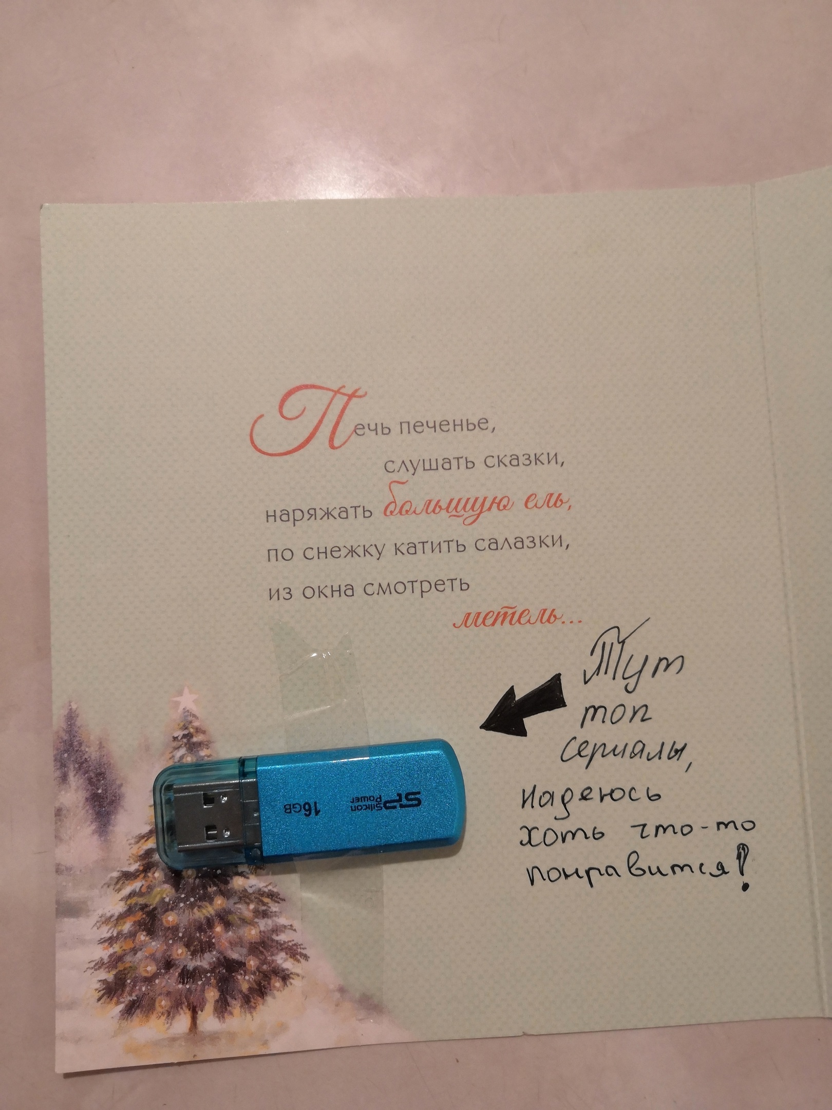 Первое, что я тут увидела -это милая открытка. Открытка не простая, а с флешкой. Решила ознакомиться с сериалами в новогодние праздники. В анкете я писала, что обожаю смотреть различный сериалы
