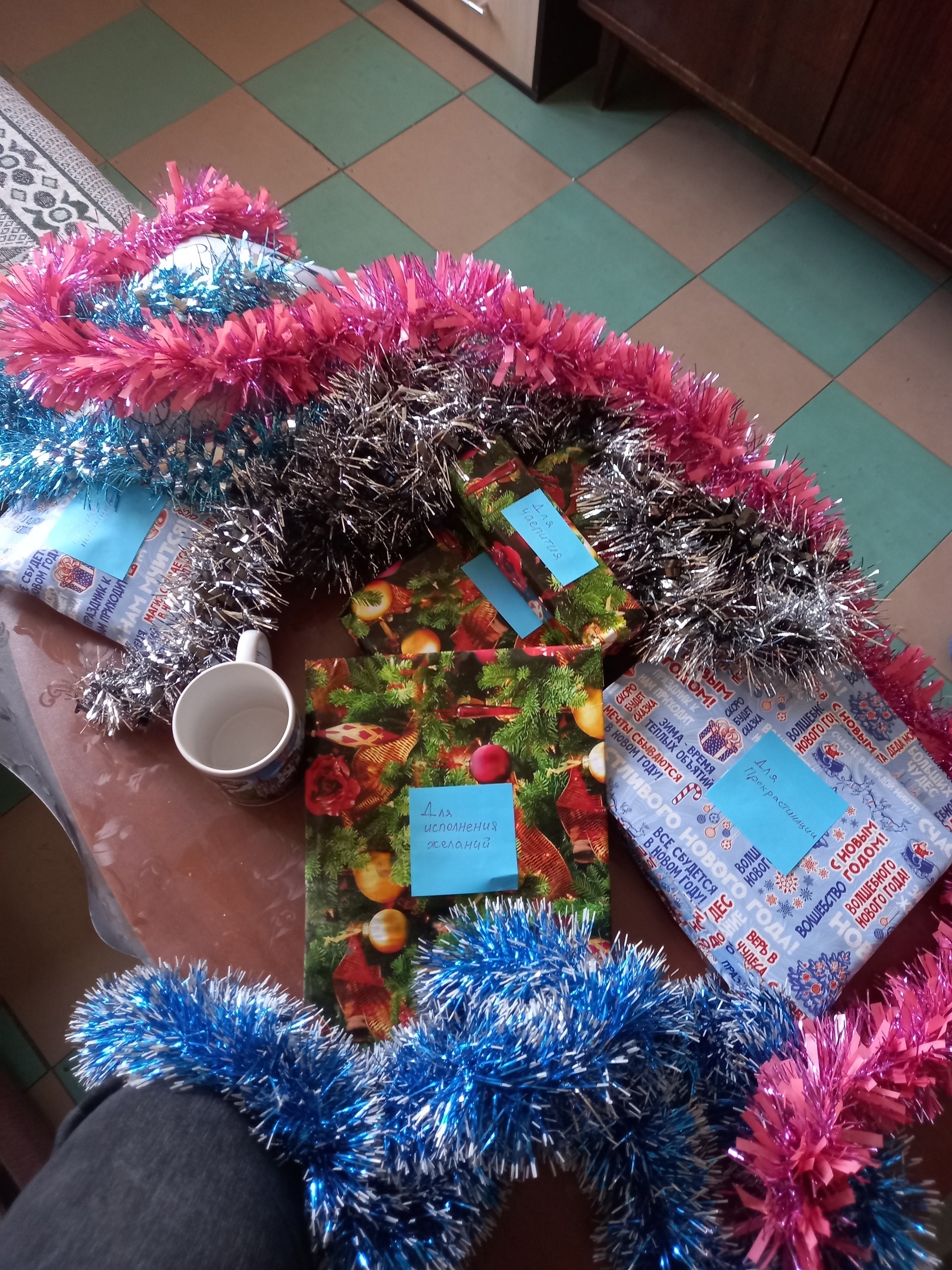 Дальше было много интересных штук, вроде теплых носочков с елочками, блокнота прокрастинатора и меда.