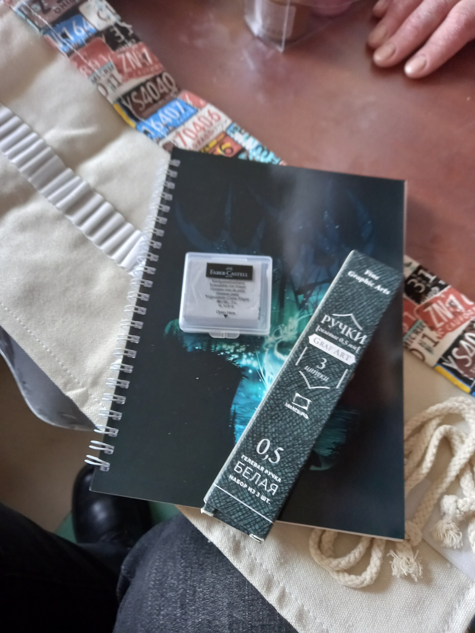 Далее идет клячка для рисования и штука для хранения кистей (никогда раньше не видела подобное, но теперь они точно не будут стоять в стакане), скетчбук с мелованными листами... Почувствовала себя дремучей, потому что рисую на чем попало х)
