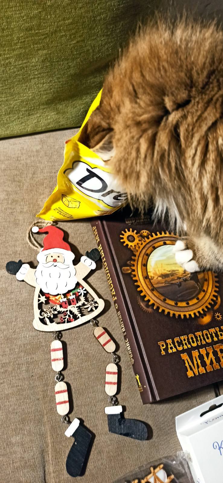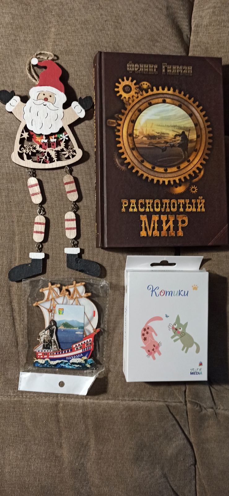 Пища для ума: книга в смешанном жанре (фантастика, фэнтези, стимпанк), как раз на каникулах почитаю, настольная игра с котиками - на внимательность, именно то, что я люблю, классная подвеска - дед Мороз и красивый магнитик.
