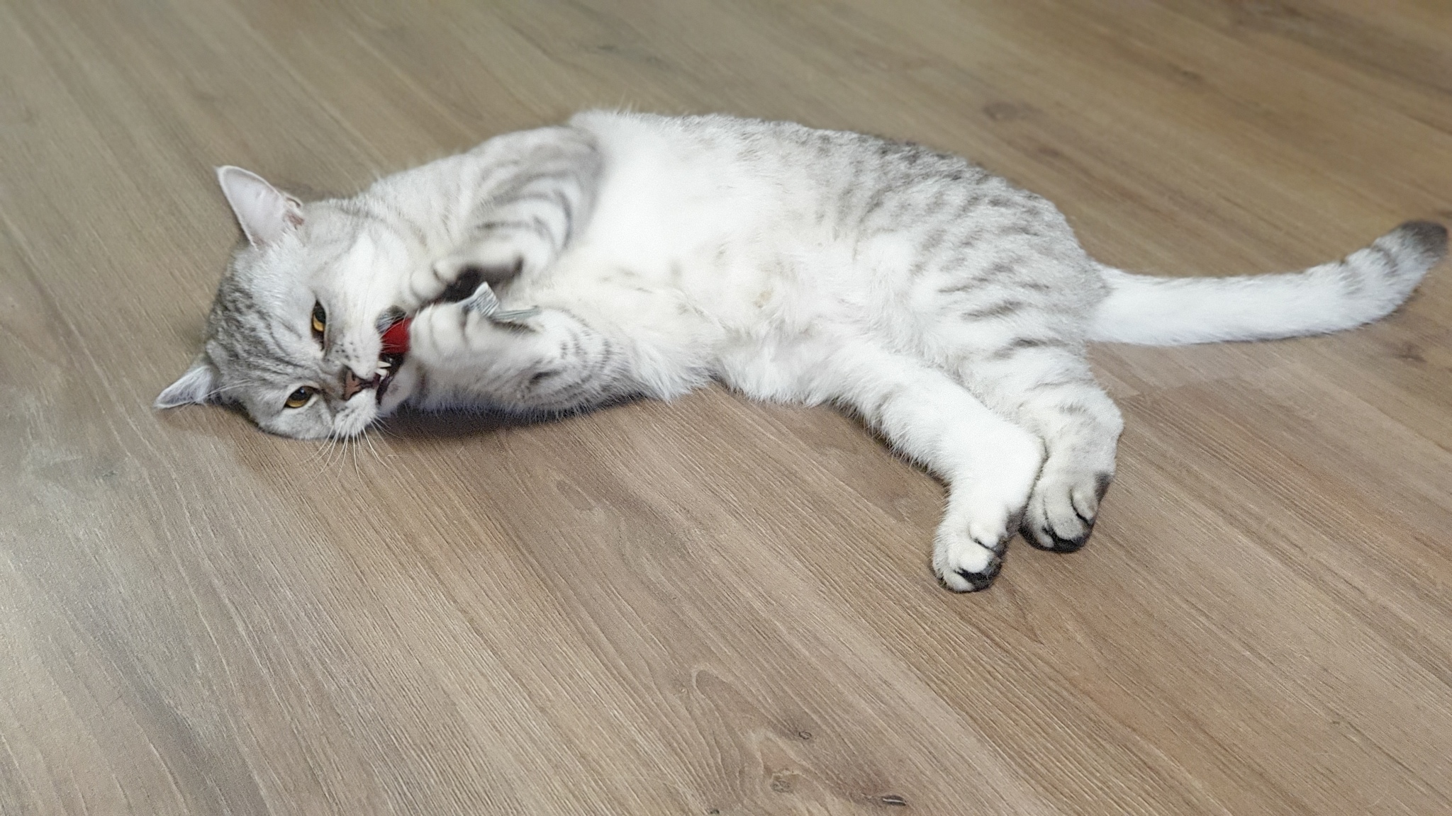 При распаковке кот вцепился мне в руку, откопал один из своих подарков - мышь, и тут же унёс его: