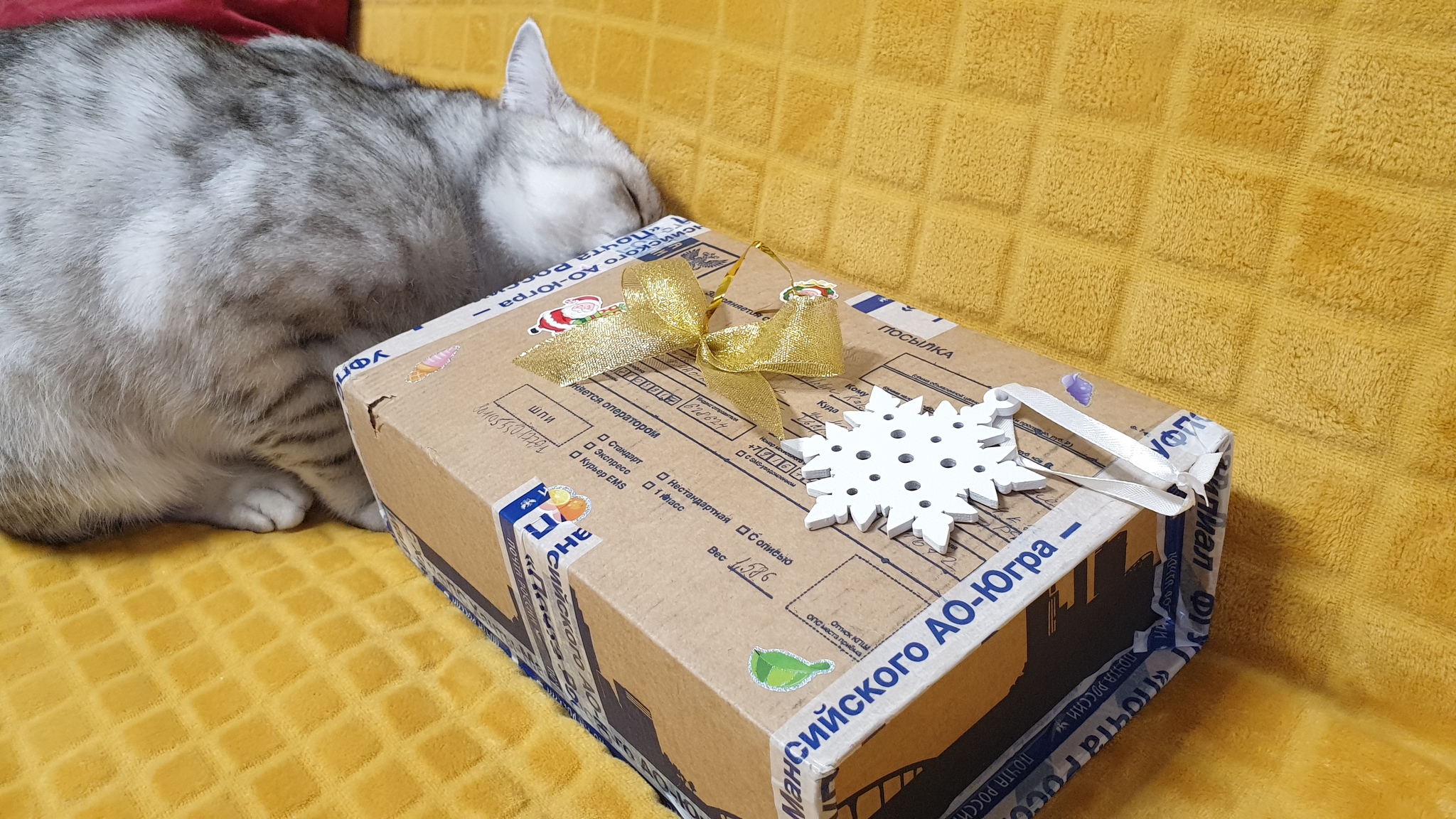 Общий вид коробки с новогодними наклейками (без кота не обошлось):