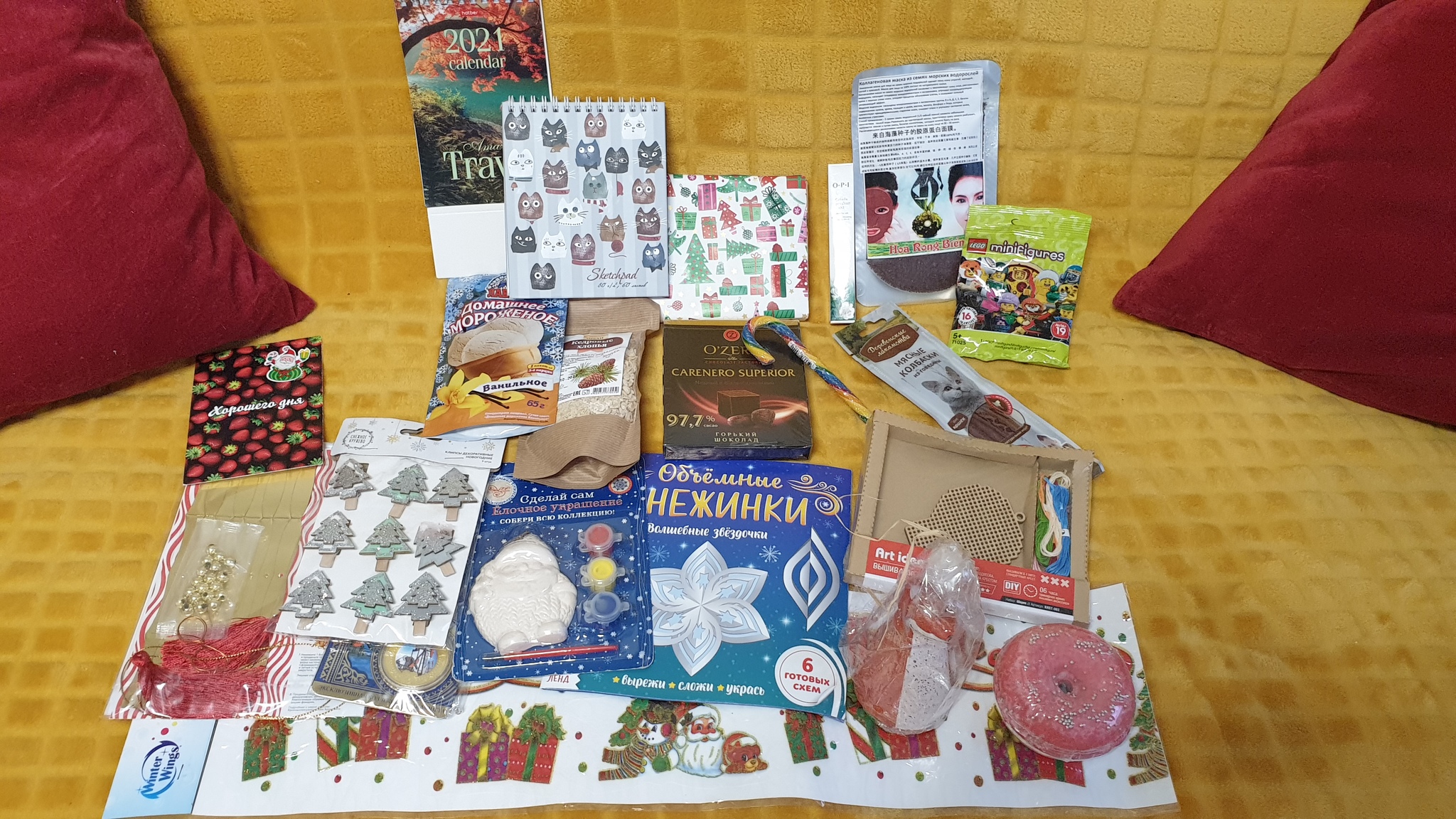 Очень много новогодних украшений, все точно пригодятся, потому что у нас дома их довольно мало, каждый год приобретаем понемногу) Маска для лица, бомбочка для ванны, масло для кутикулы, вкусняшки для людей и кота - точно в цель, блокнот тоже, потому что я блокнотный Плюшкин, обожаю их)