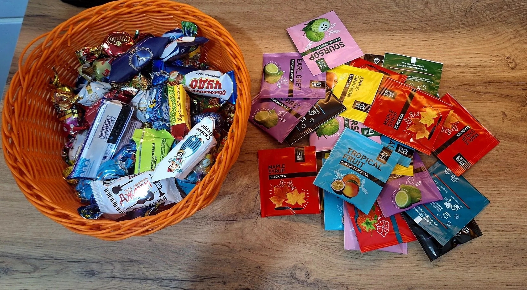 Тут же его определили к остальным конфетам. Так же, в сладком подарке, была россыпь чайных пакетиков. Один уже попробовали - очень вкусный! Спасибо большое за такой тёплый и вкусный подарок, Снегурочка!