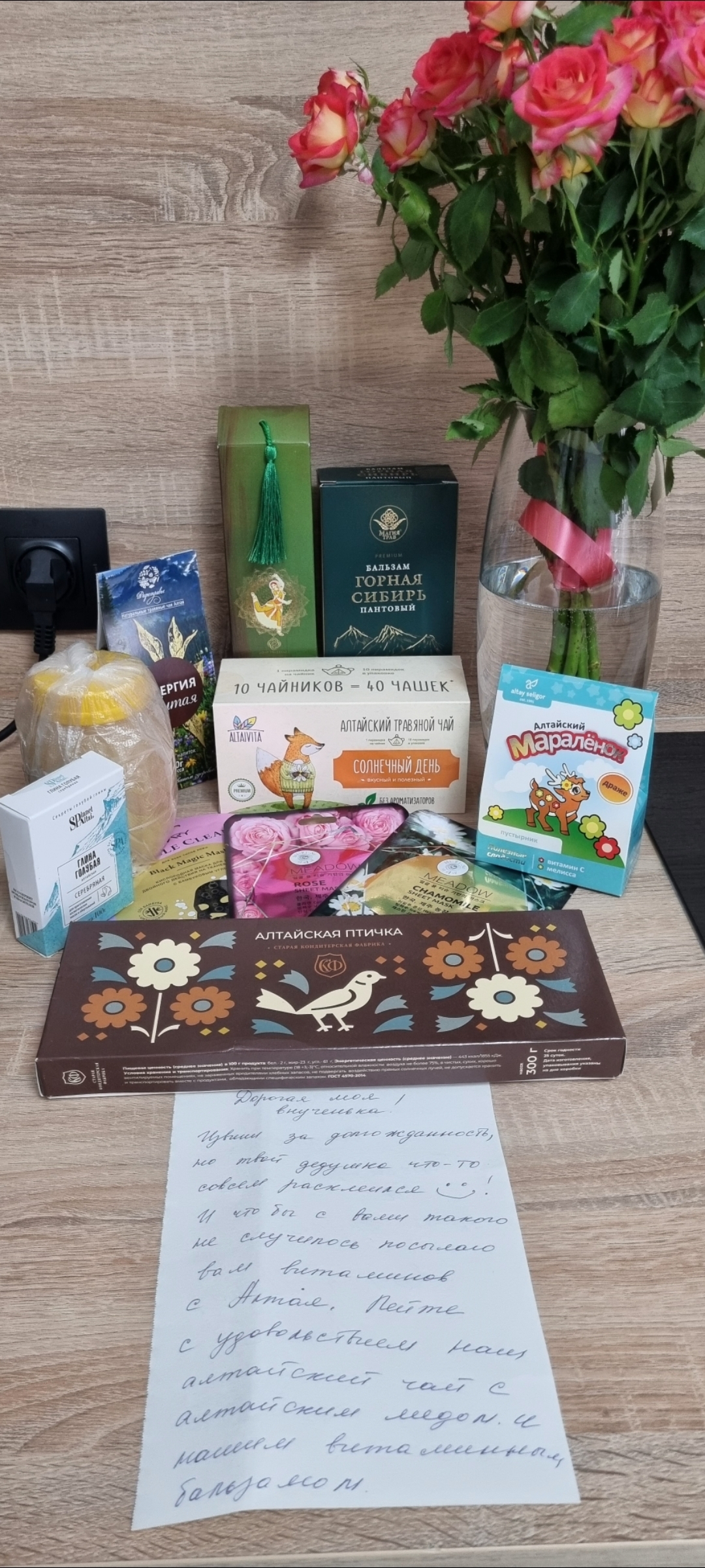 Теперь о том что тут есть. Алтайский мед. Еще не пробовала, но знаю, что это здорово! Два вида чая. Тот который в пакетиках я уже попробовала и это восторг. Любимый чебрец! Запах, вкус - мммм! Глина для лица + маски. Обязательно попробую на днях. Для старшего сына витамины (с+мелисса). Он у меня любитель понервничать, так что прям то что надо. Да и так же любитель поболеть, так что чай и мед тоже сейчас очень кстати! Бальзам. Ух! Обязательно попробую, как только поправлюсь окончательно. Конфеты птичье молоко. Свежие и с чаем заходят на ура. Ароматические палочки. Я не особо их любитель. Но тоже попробую. Может и стану любителем. И очень понравилось... письмо) оно очень милое и душевное. Написанное на бумаге. Действительно письмо. Я читала его и будто общаюсь с родственником, которой знает что мы все сейчас болеем. Не знаю как это передать. Теплое чувство