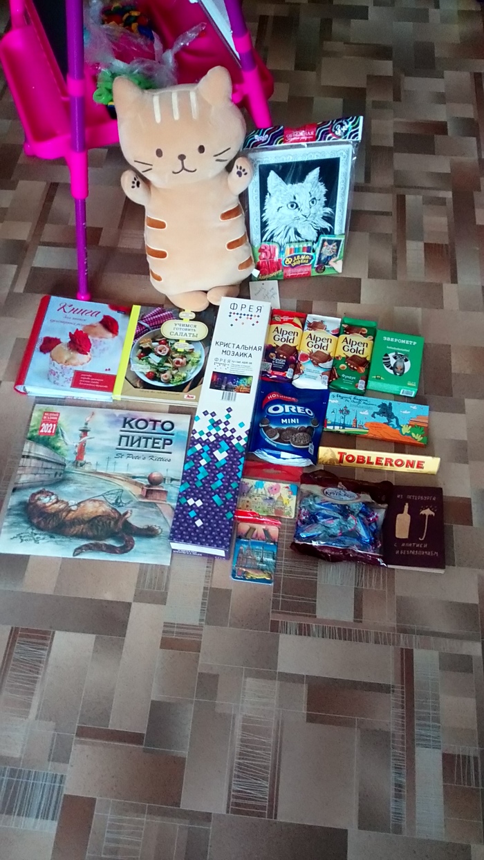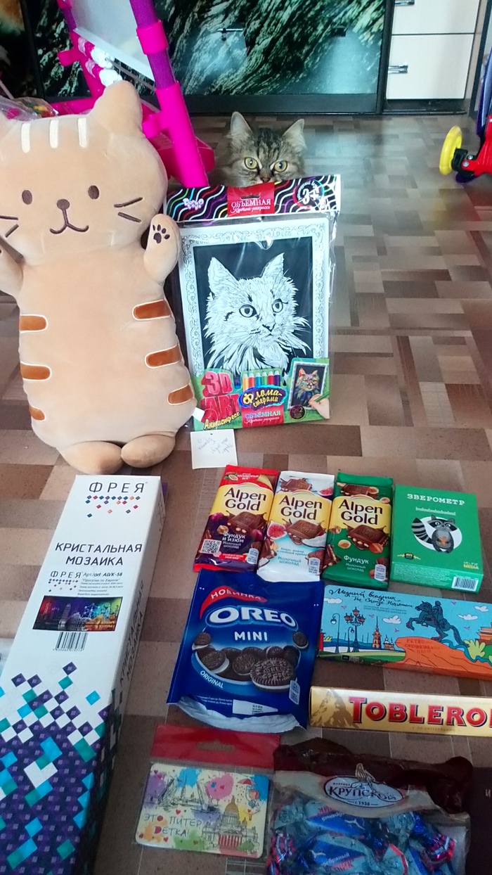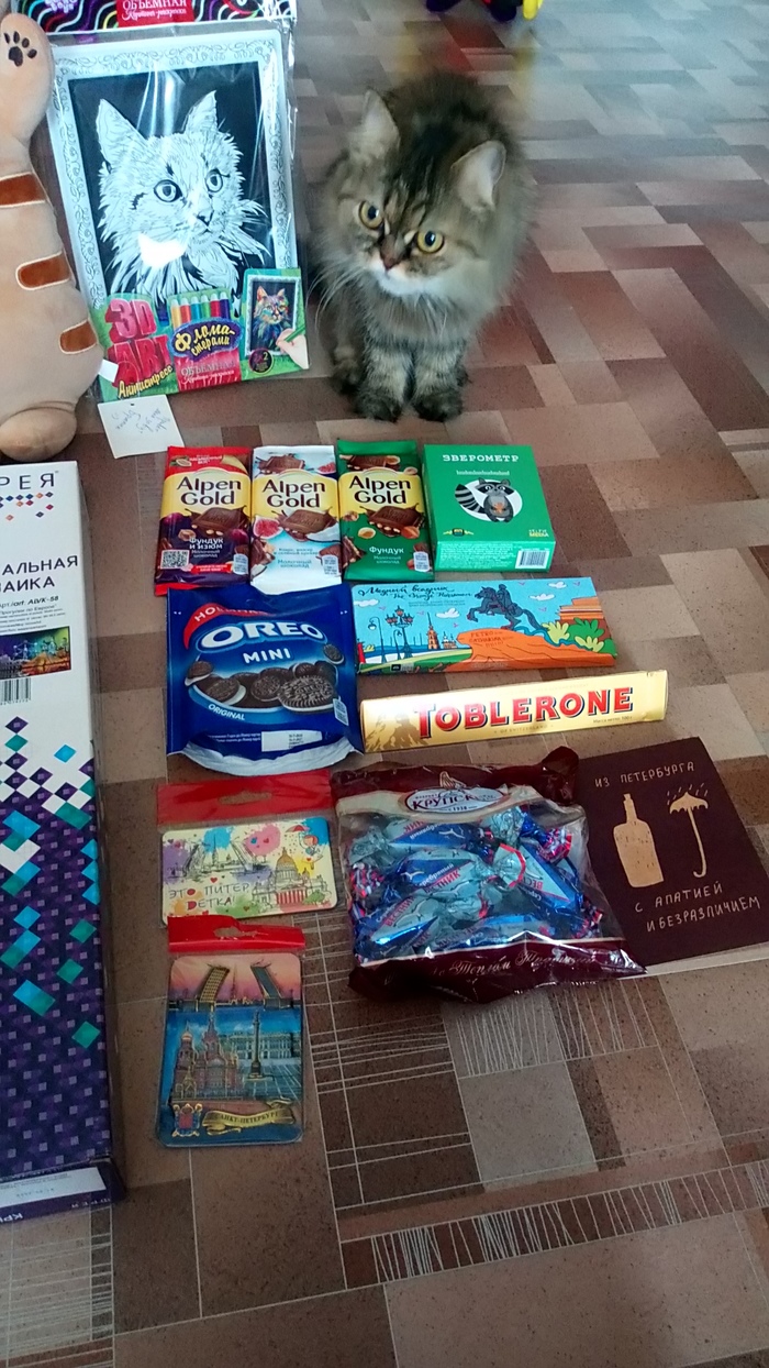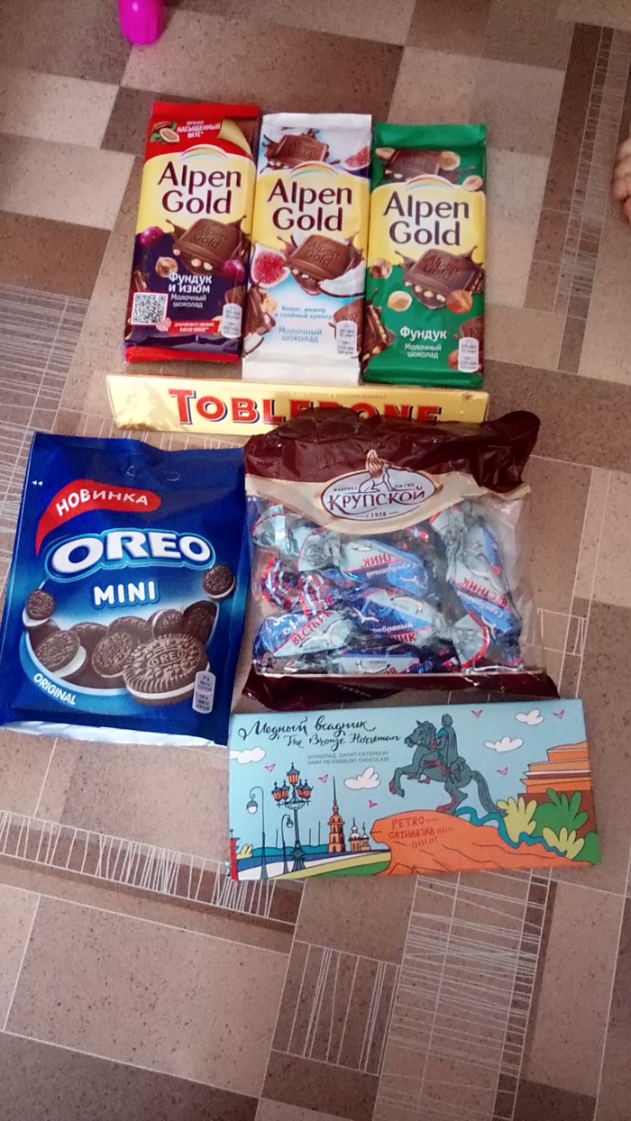Конечно же это сладости. В анкете у меня указано что я сладкоежка и мой дедушка не оставил это без внимания. Молочный шоколад с нугой и орешками очень вкусный, Питерский ещё не попробовали.