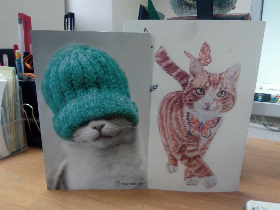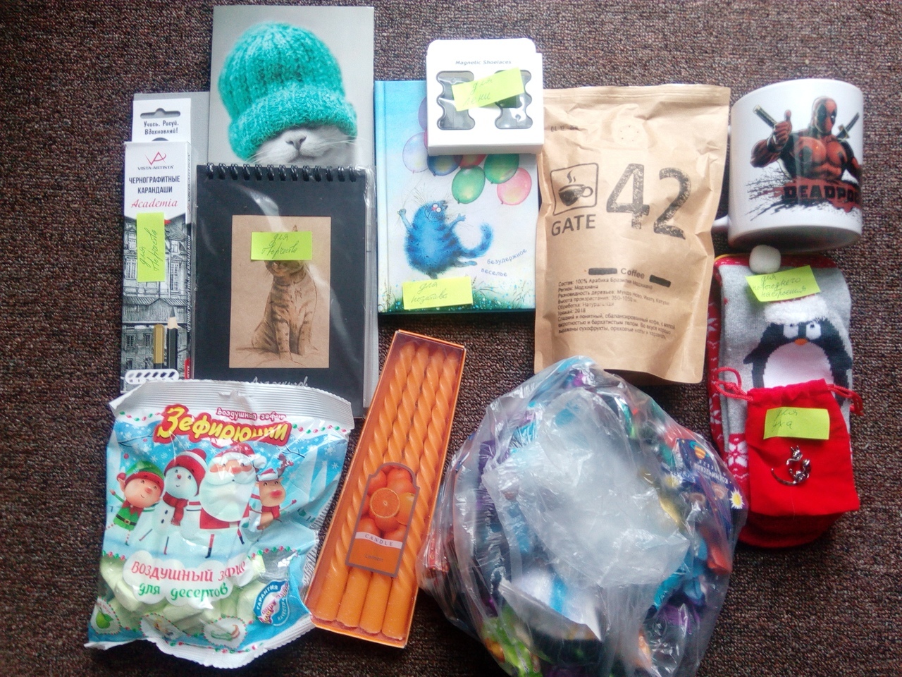 Открытка с котиком заняла почетное место на моем рабочем столе в офисе и даже уже нашла себе друга, а Дэдпул уже попытался подкатить к кружке с Хомурой Акэми, но был отвергнут:( Свечи и вкусняшечки были отложены для новогоднего застолья.
