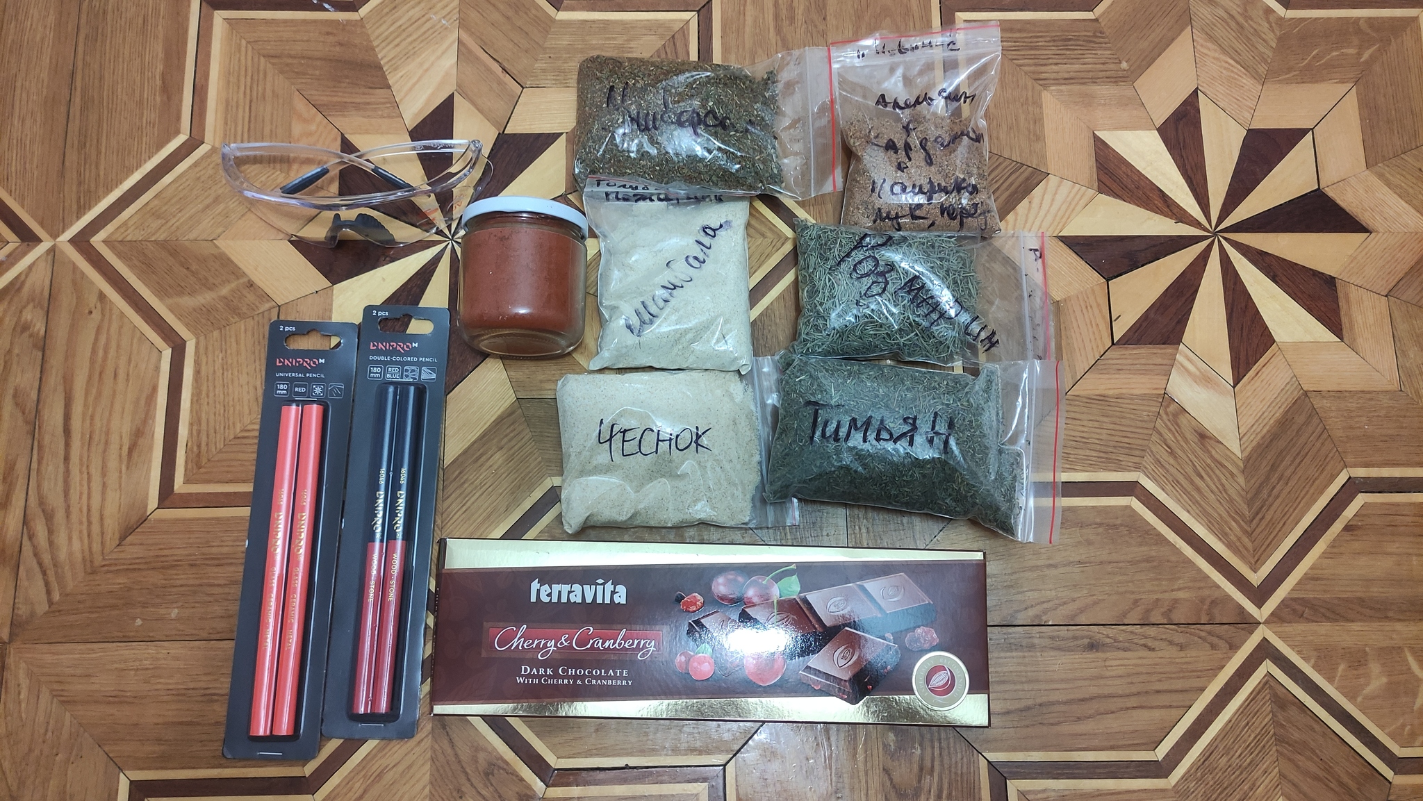 Как то упустил этот момент. Исправляюсь. Правда конфет уже нет. Специи: чеснок, копчёная паприка в баночке, тимьян, розмарин, пажитник, и смесь разных трав и специй