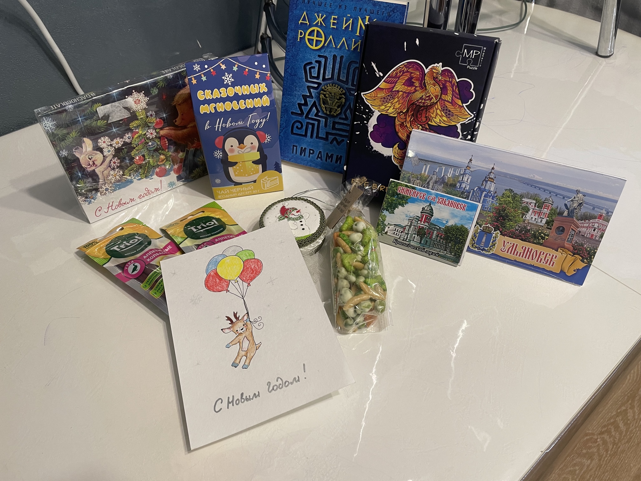 Конфетки, чай, набор открыток с Ульяновском, магнит, снеки с васаби, вкусняшки для котиков и песиков :), книга, деревянный пазл и самое крутое! Открытка и ёлочная игрушка, сделанные своими руками!