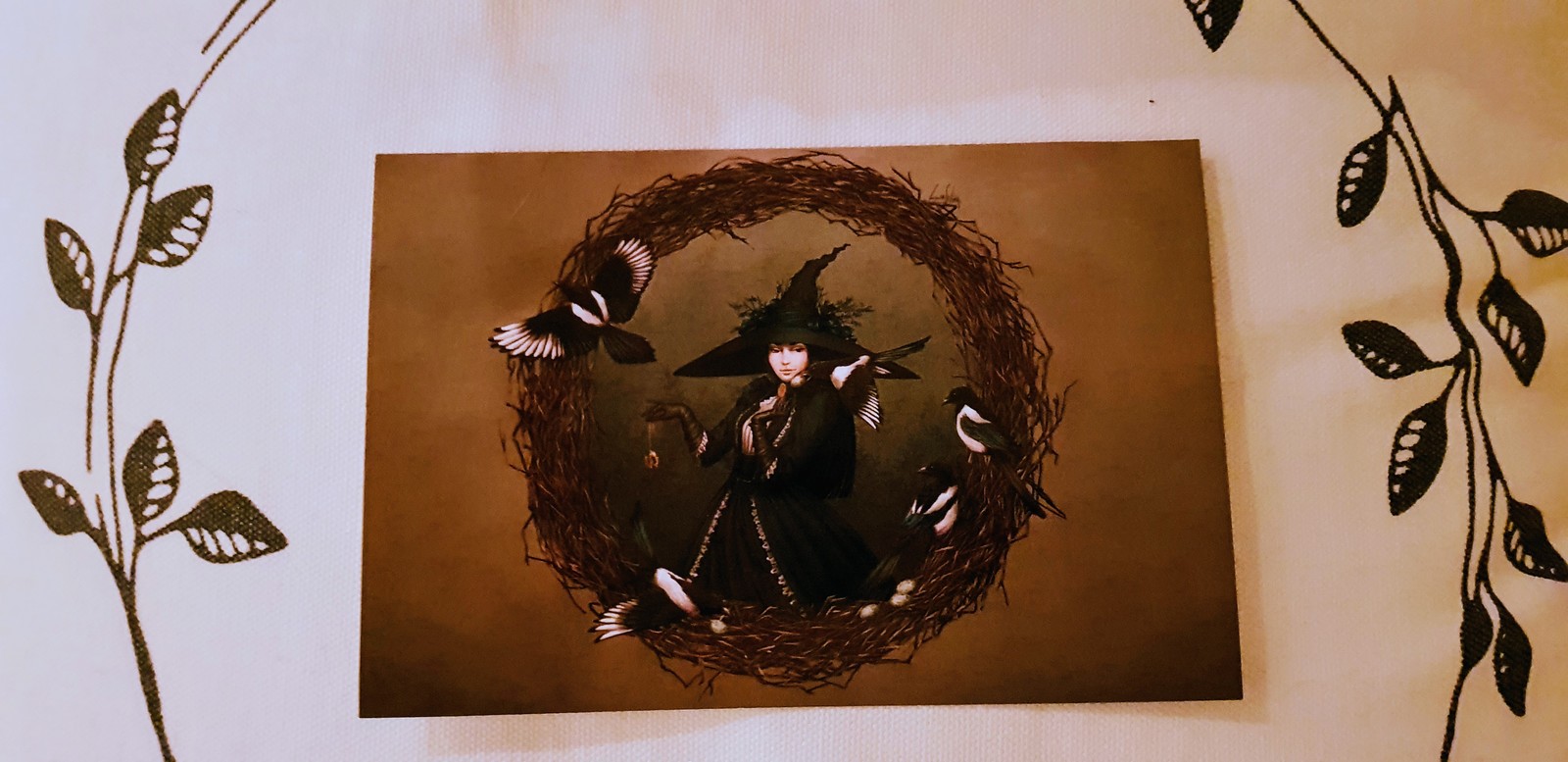 На обложке встретила ведьма вЕщица. Символ начала из конца, иначе ее называли ведьма-сорока. На обратной стороне пожелания, надеюсь, что сбудутся)(Лен, я про год) Далее магнит: