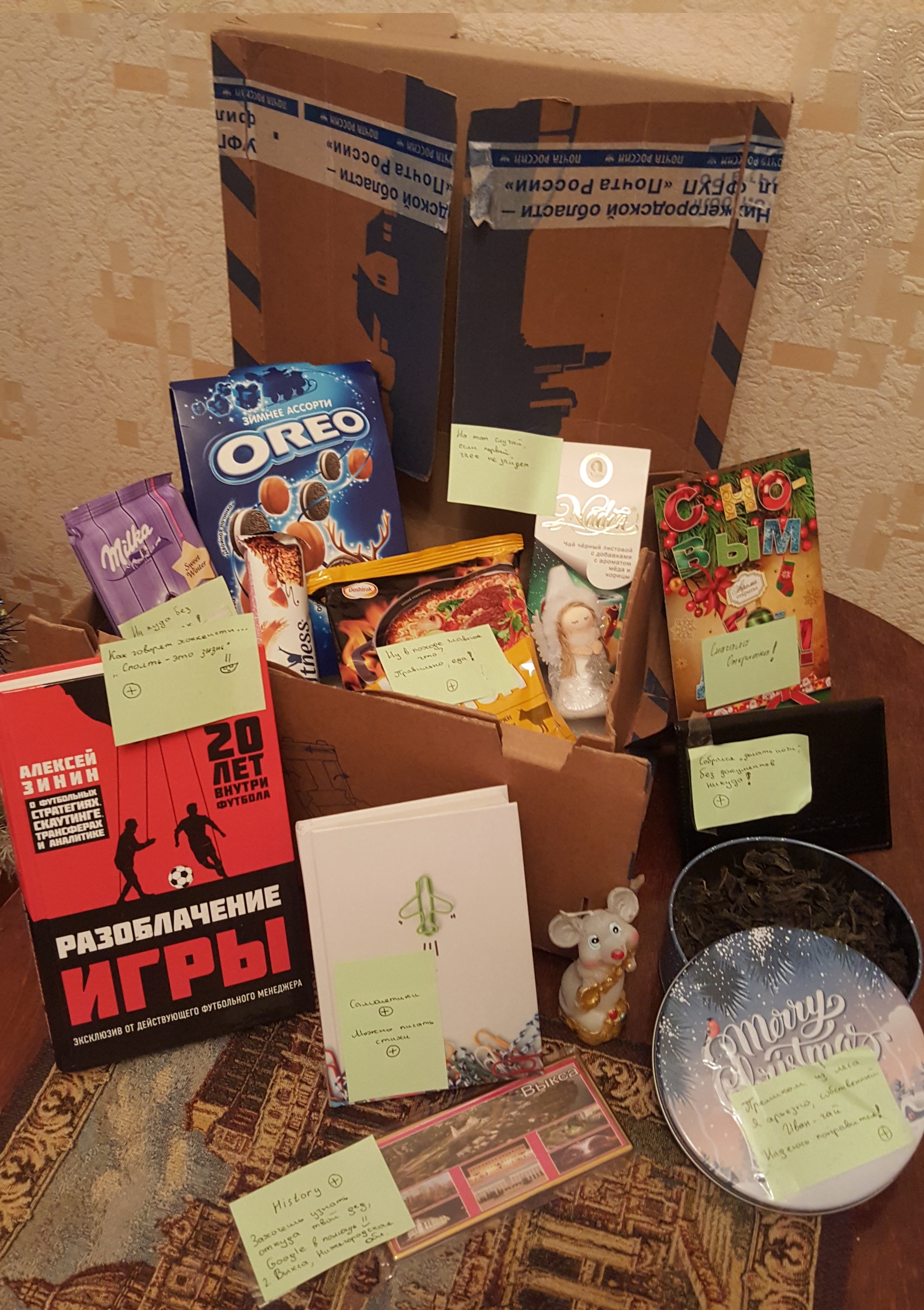 Дед Мороз, да ты все продумал! Что самое клёвое, так это то, как ты подошел к оформлению всего подарка. Все было запаковано весьма продуманно, и сопровожденно милыми посланиями! Особенно доставило "Собрался "делать ноги" - без документов никуда" :D Замечательное теплое поздравление в открытке, куча вкусняшек, полезных батончиков, да и Рамён в дальнюю дорогу в придачу. Я обожаю Oreo еще со времен летней W&T в "макдаке" в штатах.