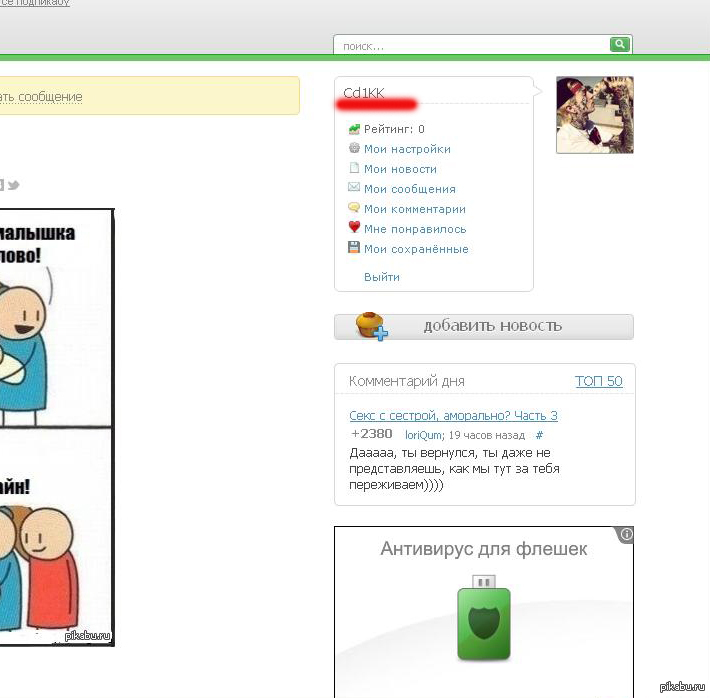 Umo4Ka Админы шалят? 12 лет назад Зашла на пикабу, и почему то автоматом попала в чей то аккаунт, сразу вышла. Меня не радует то что в мой так же могут попасть!!! [моё] Пикабу
