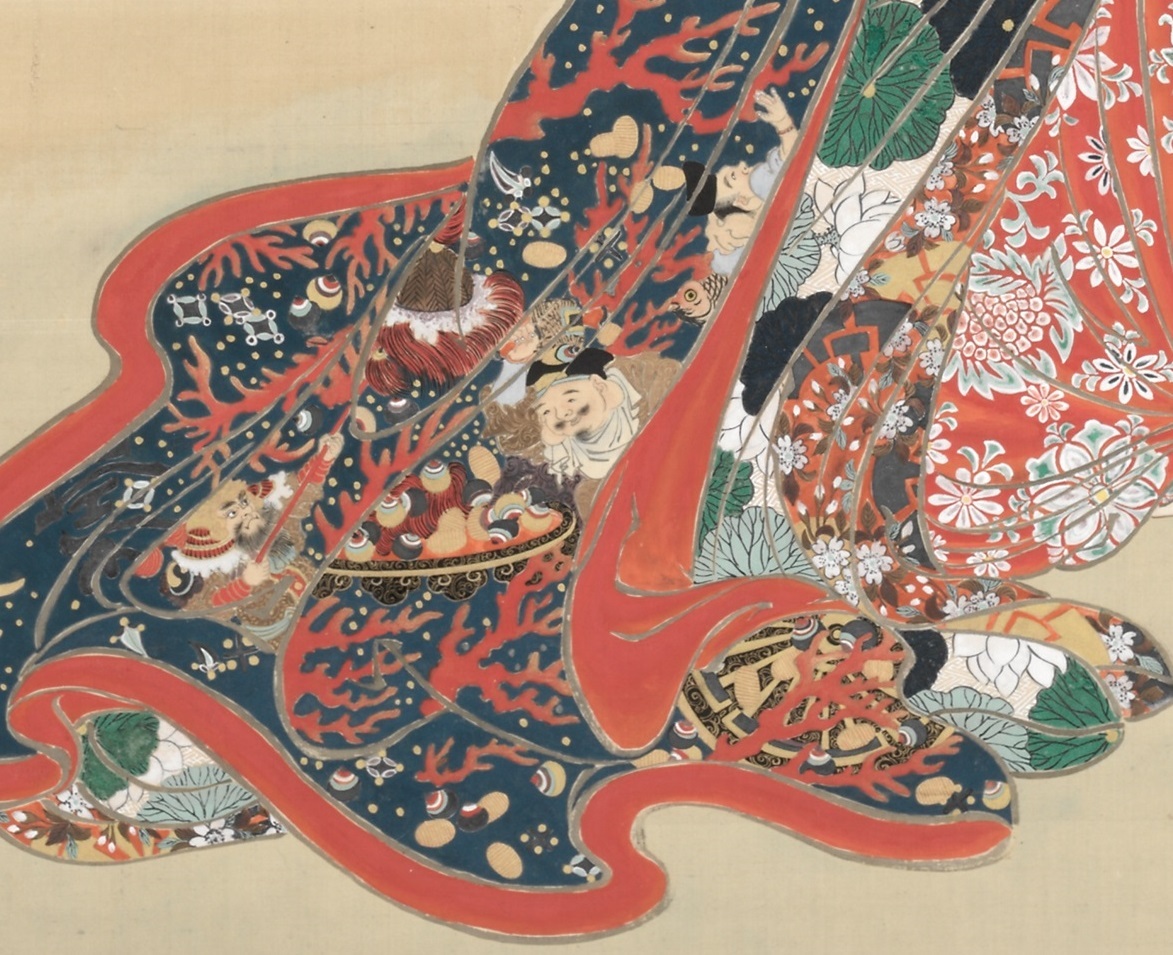 Здесь куртизанка выступает в роли Бензайтэн – богини счастья и воды, а остальные шесть из синтоистских Семи богов счастья изображены на её одежде. Один из них доносит о грехах владыке ада Эмме, который выносит приговор недавно умершему человеку.