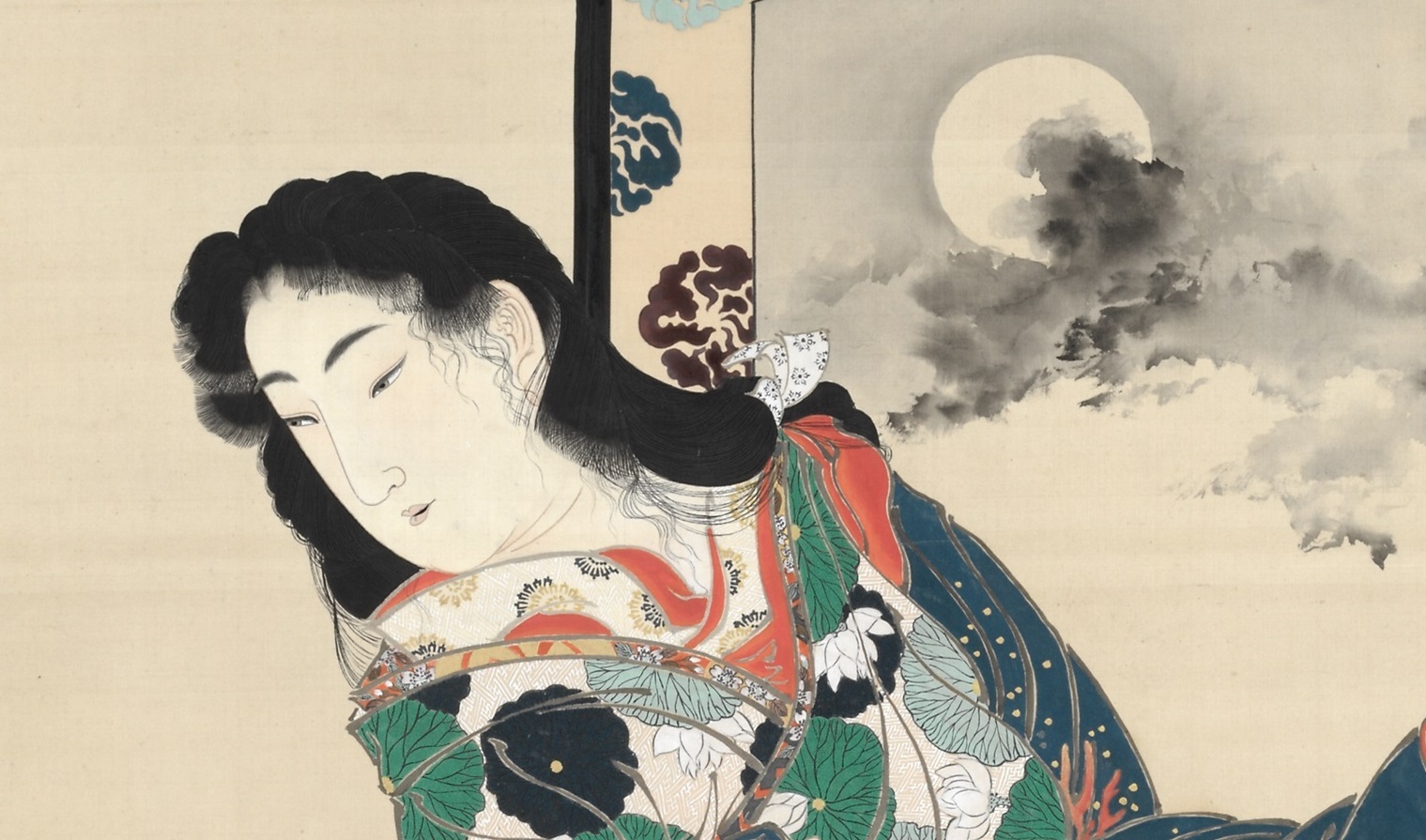 На свитке изображена стоящая перед ширмой известная куртизанка 15-го века, прославившаяся тем, что носила одежду с изображениями буддистского ада. Легенда гласит, что она была похищена бандитами и носила эту одежду, как символ своей веры в то, что её страдания в нынешней жизни – это наказание за грехи, совершённые в прошлой жизни.