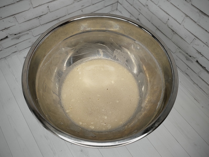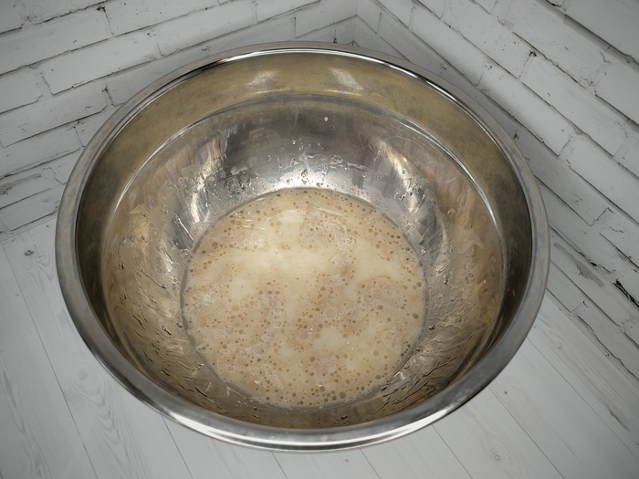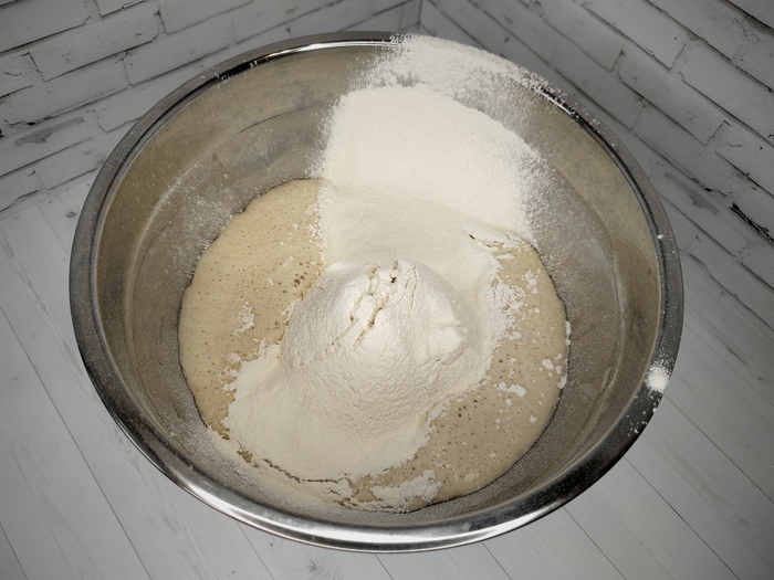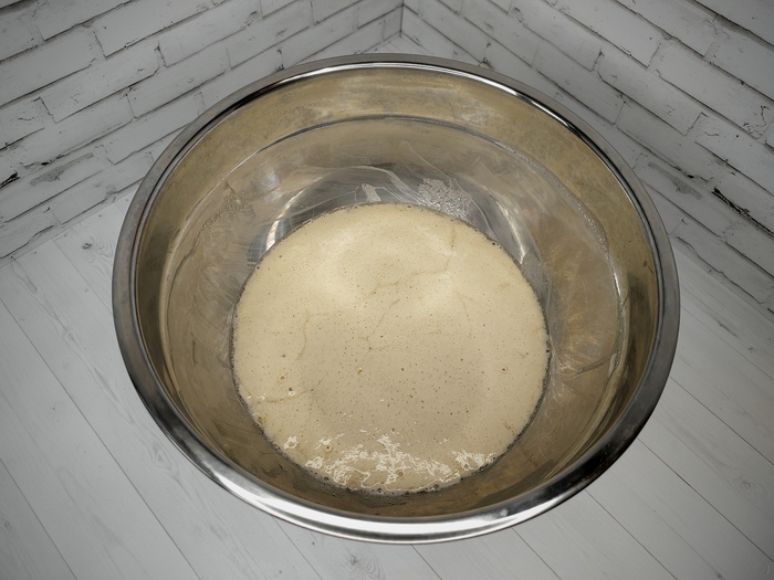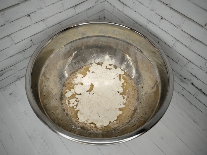 2. Дрожжи начали работать, и месиво пошло пузырями. Возьмём муку и просеем где-то 2/3 оной в получившуюся жижу. Перемешаем. Ещё раз перемешаем.