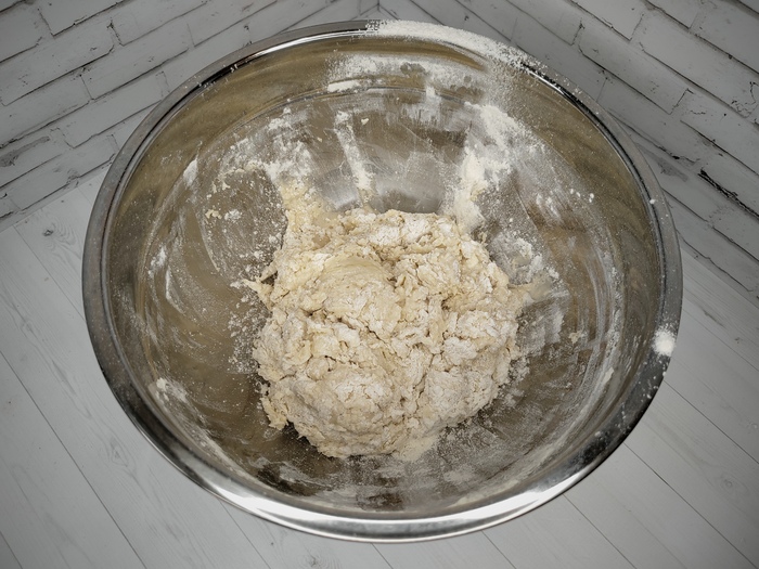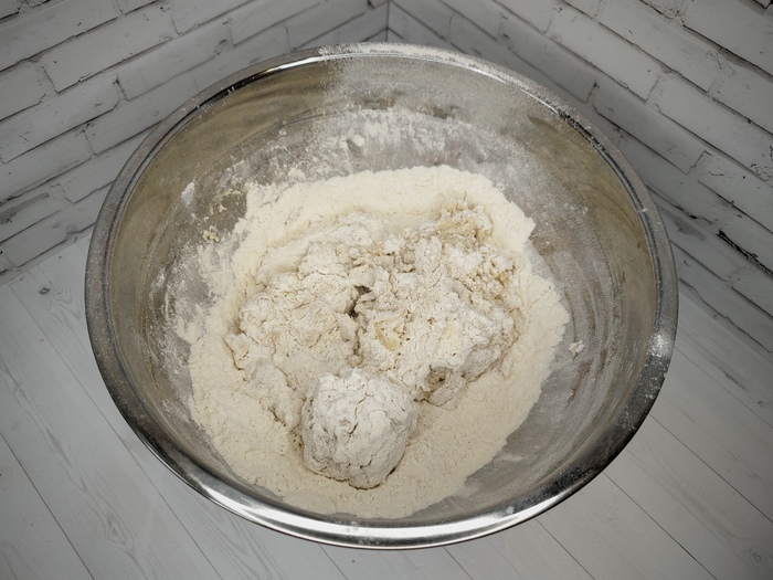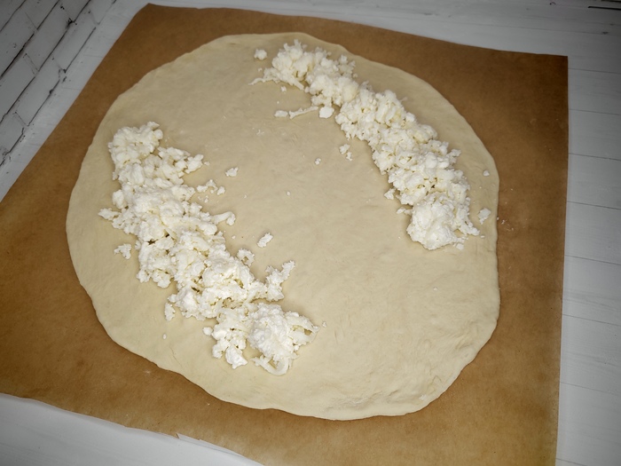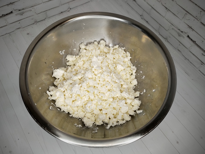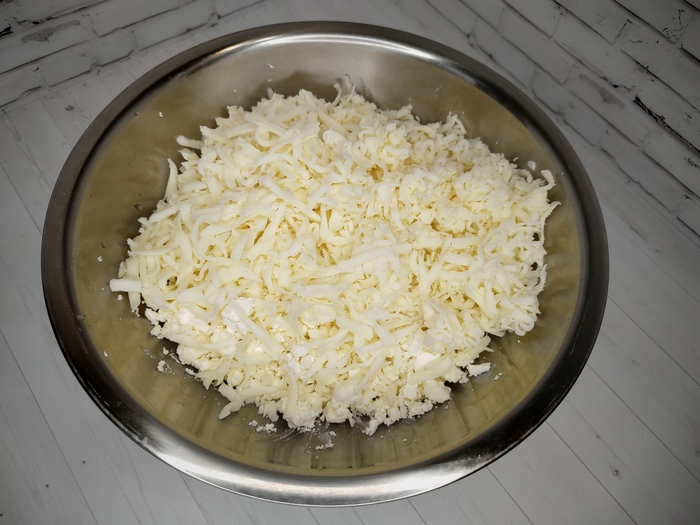 6. За полчаса до окончания срока заточения теста ломаем руками имеретинский/адыгейский сыр в относительно мелкую крошку (хотя бы, как творог), натираем на крупной тёрке сулугуни.