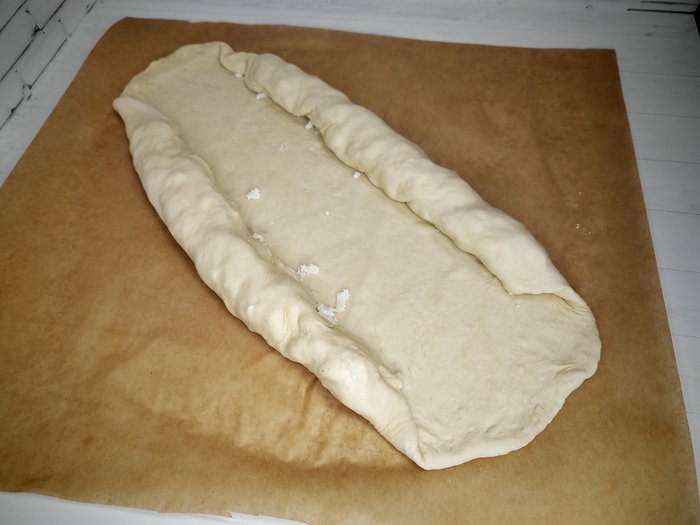 11. Вдоль длинных краев овала выкладыватем две "колбаски" из начинки. Закручиваем борта.