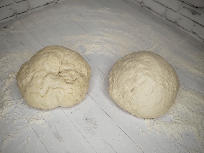 8. Достаём тесто, обминаем делим на два одинаковых куска.