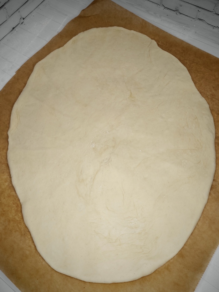 9. Первый из кусков сначала растягиваем в круг/овал руками. Затем начинаем прокатывать его скалкой. Должен получиться эллипс/овал. В принципе, можно практически сразу начинать работать на пекарской бумаге.