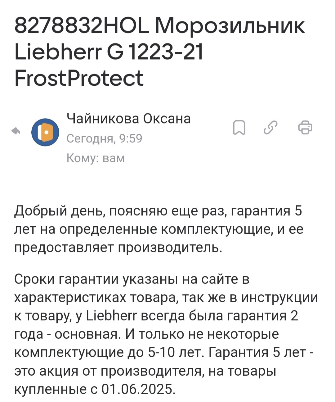 Купила 2 года назад моя подруга в этом магазине морозильник Libherr. На сайте в каталоге на нем красовалась надпись "ГАРАНТИЯ 5 ЛЕТ", как, впрочем, красуется и сейчас. Ну круто же, подумала она, и купила морозильник с чудесной гарантией. Прошло ровно 2 года и морозильник сломался. Вспомнив про гарантию, она позвонила в сервисный центр, где ей сказали, что магазин ввел ее в заблуждение и гарантия только 2 года. Тогда она позвонила в магазин и операторы (не один, а целых три штуки в разные дни), найдя ее заказ, сообщили, что сервисный центр редиски, а гарантия у нее 5 лет, честно-честно, но вот, чтобы ее получить, надо написать обращение. Написала. Ответ на скрине - пошла нафиг, мы тебе тогда наврали про гарантию, чтоб ты купила, хахаха.