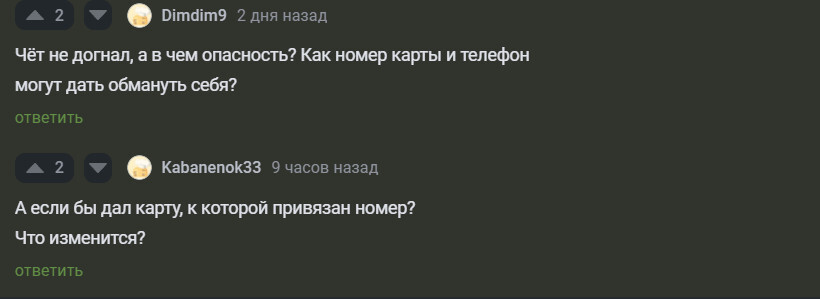 У меня подобный прикол был. Чел звонит - куплю мотор лодочный, вышлите куда перечислить деньги. Вроде вопросов не должно возникать. Я отвечаю, номер телефона устроит? - Да, конечно! Высылаю ему номер телефона. Перезванивает. - Номер карты скажите, через номер телефона не получается. Я отсылаю номер карты, к которой не привязан номер который я отсылал ранее. Перезванивает - у вас номер телефона не подвязан к карте! - Знаю, говорю. Иначе я бы вам просто отправил всю наличность лежащею у меня на счете))) Матюкнулся, не проскочило.