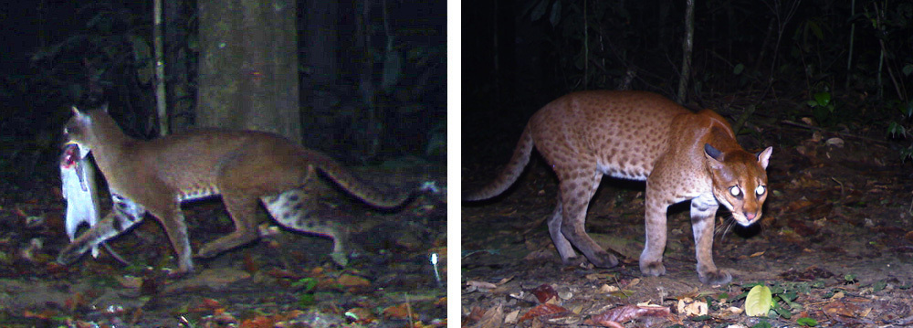 Снимки золотых кошек с фотоловушек: одна уносила добычу, другая демонстрировала свои характерные отметины.