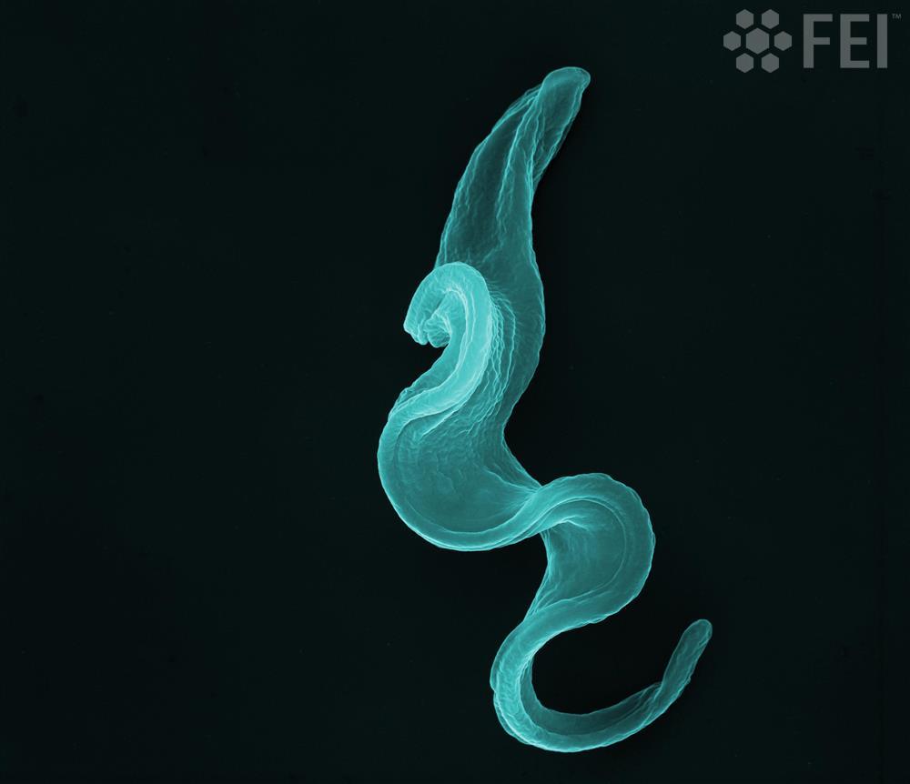 На снимке, СЭМ-изображение паразита Trypanosoma brucei gambiense (длина 15 микрометров), вызывающего сонную болезнь человека в Западной и Центральной Африке, окрашенное в ложные цвета.