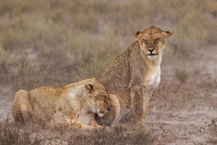 Львицы под дождем у водопоя Камперсбум в трансграничном парке Кгалагади, Южная Африка.