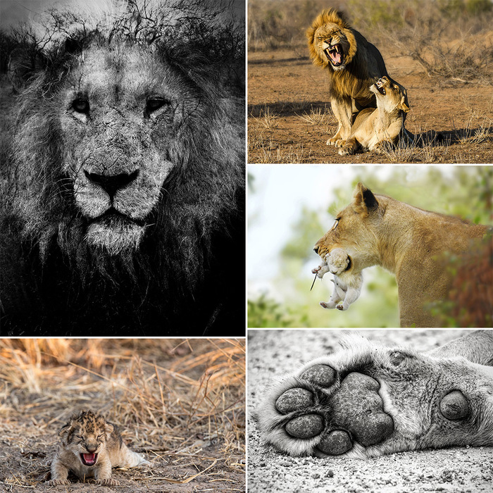 По часовой стрелке сверху слева: 1) Портрет льва в частном заповеднике Торнибуш, Южная Африка. 2) Спаривание львов в национальном парке Крюгера, Южная Африка. 3) Львица несет своего белого львенка в частном заповеднике Нгала, Южная Африка. 4) Львиная лапа крупным планом. 5) Очень молодой львенок зовет свою мать в национальном парке Южная Луангва, Замбия.