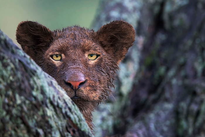 Молодой лев в грязи, национальный парк Серенгети, Танзания.