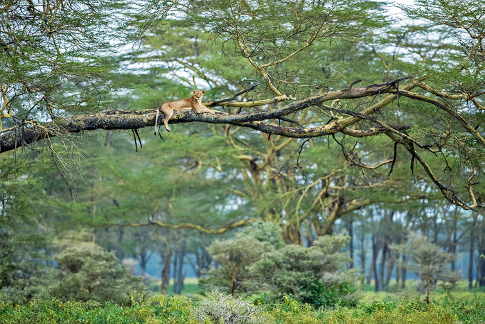 Лев отдыхает на дереве в национальном парке озера Накуру, Кения.