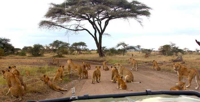 Львиный прайд окружил гостевую машину в национальном парке Серенгети, Танзания.