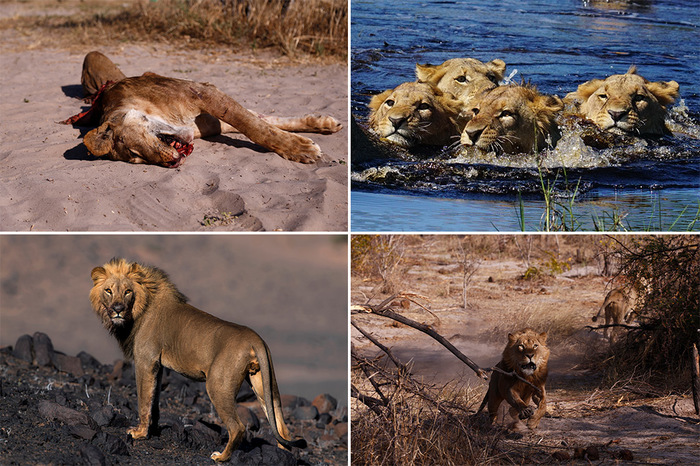 По часовой стрелке сверху слева: 1) Этот лев был сбит грузовиком на дороге в Ботсване. 2) Львы переплывают реку в равнинах Дуба в Ботсване. 3) Лев нападает в Ботсване. 4) Лев, адаптировавшийся в пустыне Намибии.