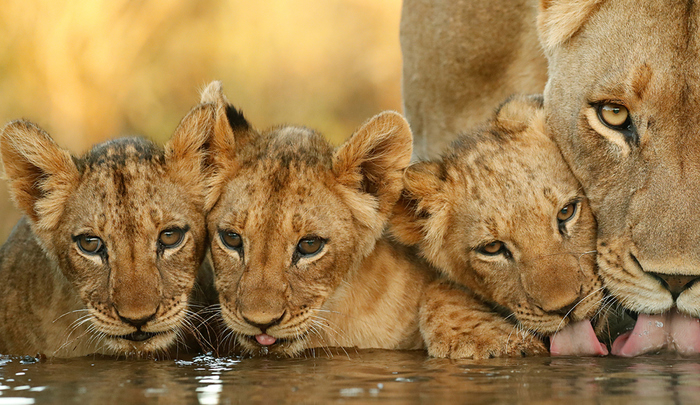 Львица и ее детёныши пьют в частном заповеднике Зиманга, Южная Африка.