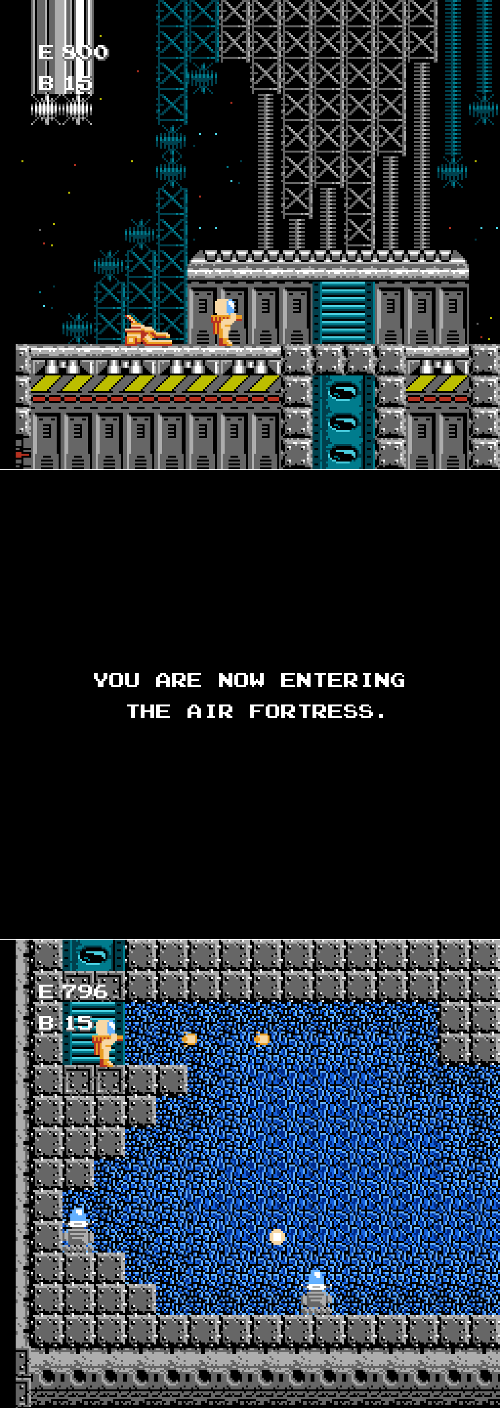 Внутри крепости нам встречаются разнообразные враги, включая "толстых", в которых лучше стрелять бомбами. Энергия, полученная в первой части уровня теперь расходуется на полёты на реактивном ранце и стрельбу. Энергия, затраченная на полёт, постепенно восстанавливается, пока вы стоите на поверхности, энергия, потраченная на выстрелы - когда вы перестаёте стрелять. Также энергия тратится при контакте с врагами и их оружием, полученный урон не восстанавливается. Интересная особенность - при выстреле вас немного откидывает назад - некая реалистичность выстрела в невесомости. С каждым следующим уровнем появляются новые более сложные враги, самые неприятные - те, что могут перемещаться по всему экрану, а в добавок ещё и стрелять. Из уничтоженных врагов также выпадают пополнения бомб и энергии. Помимо стандартных врагов присутствуют и логические элементы (мне сразу вспомнилась игра Cybernoid - The Fighting Machine).
