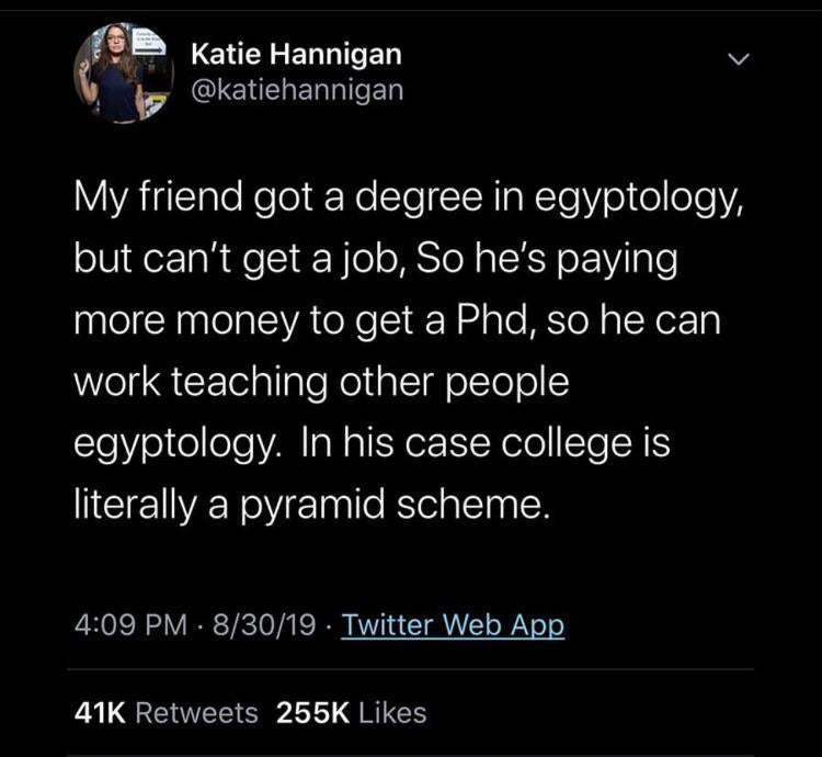 Мой друг получил высшее образование по египтологии, но не может найти работу. Из-за этого он сейчас платит больше денег, чтобы получить аспирантуру для того, чтобы он мог обучать других людей египтологии. В его случае это вполне себе финансовая пирамида.