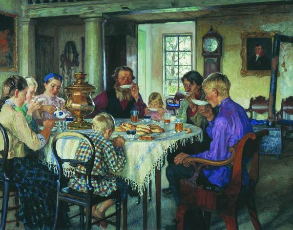 Гибнет, разоряется дворянско-помещичье сословие, богатые крестьяне становятся новыми хозяевами жизни в селе, они скупают земли, старые дворянские усадьбы. И в картине "Новые хозяева" в помещичьем старом доме за столом новые владельцы: крестьянская семья пьет из самовара чай.