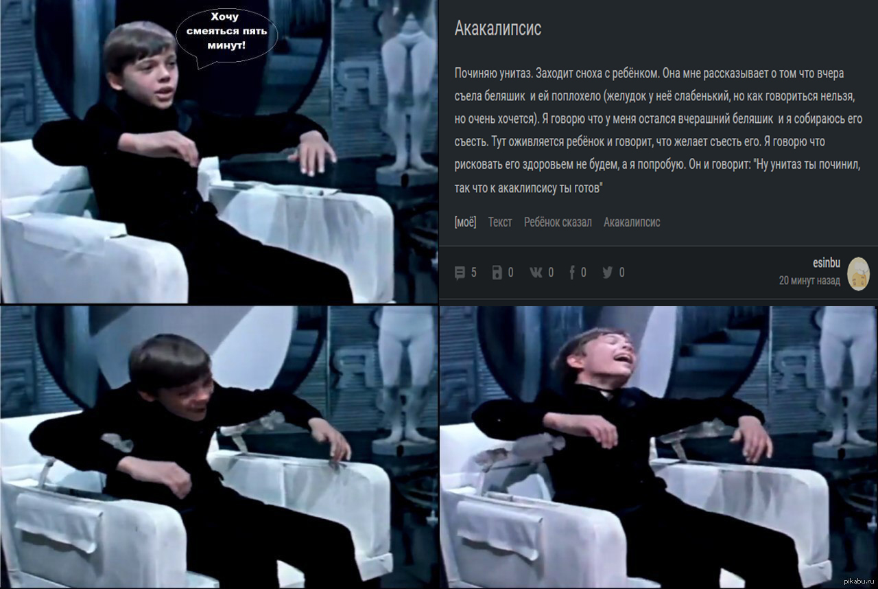 Починяю унитаз. Заходит сноха с ребёнком. Она мне рассказывает о том что вчера съела беляшик и ей поплохело (желудок у неё слабенький, но как говориться нельзя, но очень хочется). Я говорю что у меня остался вчерашний беляшик и я собираюсь его съесть. Тут оживляется ребёнок и говорит, что желает съесть его. Я говорю что рисковать его здоровьем не будем, а я попробую. Он и говорит: "Ну унитаз ты починил, так что к акаклипсису ты готов"
