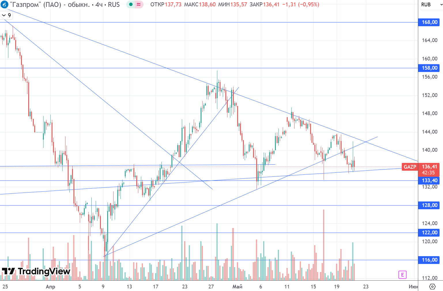 На мой взгляд, все же маловероятно, что дивиденды утвердят. Так считал и ранее, поэтому в конце апреля на бурном росте бумаг прогнозировал падение акций Газпрома от уровня ₽158 к ₽136, что довольно быстро произошло. И если дивидендов не будет, а цена сможет закрепиться ниже ₽136 и глобального аптренда, то акция, вероятно, упадет еще к уровню ₽122, может, даже к ₽116. И это уже хорошие уровни для покупки.