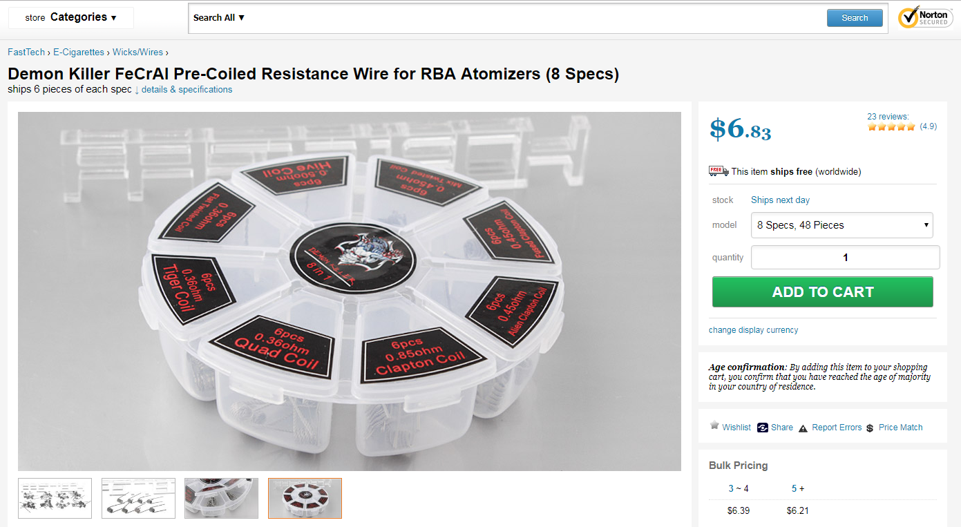 Решил ради интереса ознакомится с предлагаемой продукцией. На глаза попался набор койлов для дрипки спиралей для электронных сигарет стоимостью 351 руб. вместо аж 3178 руб.! Это ж какая экономия! Предложение часа!
